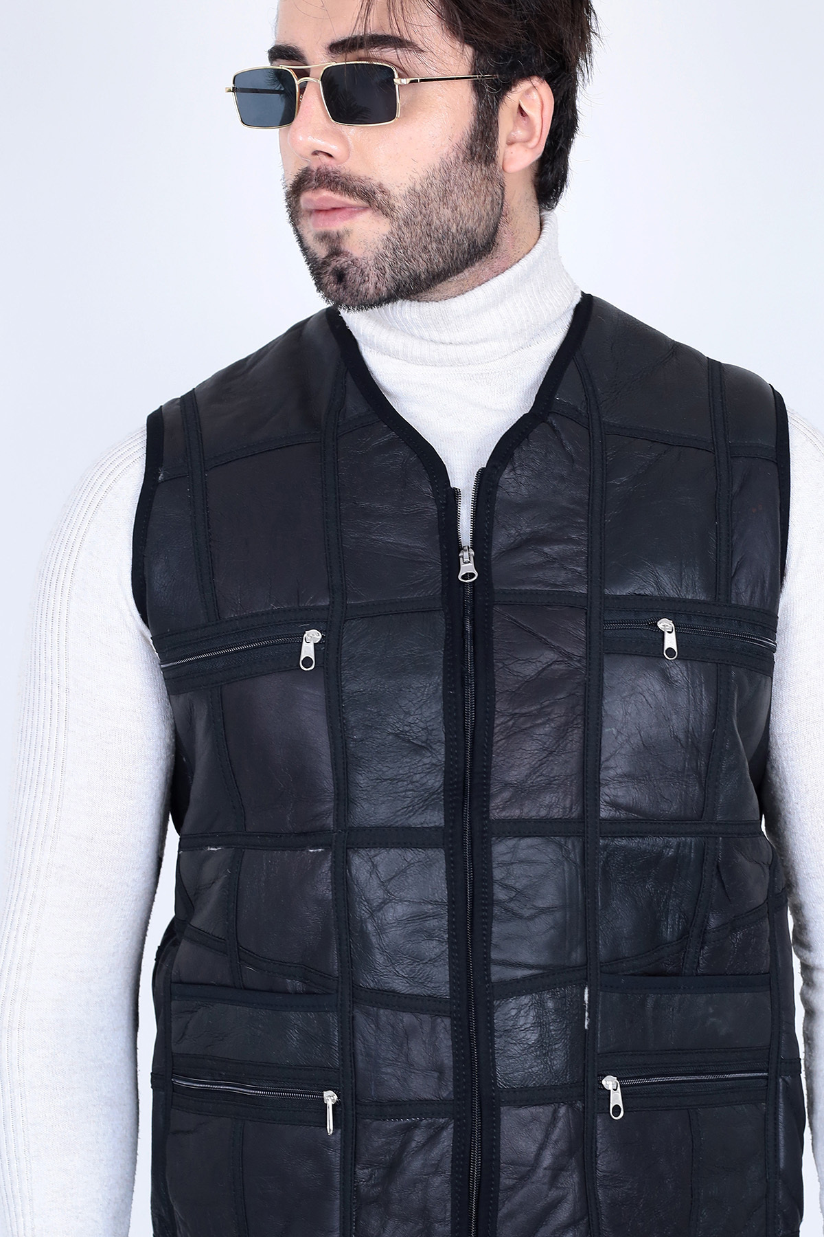 - hakiki deri malzemesiyle üretilmiş, dayanıklılığı ve şıklığı bir arada sunan yelek.