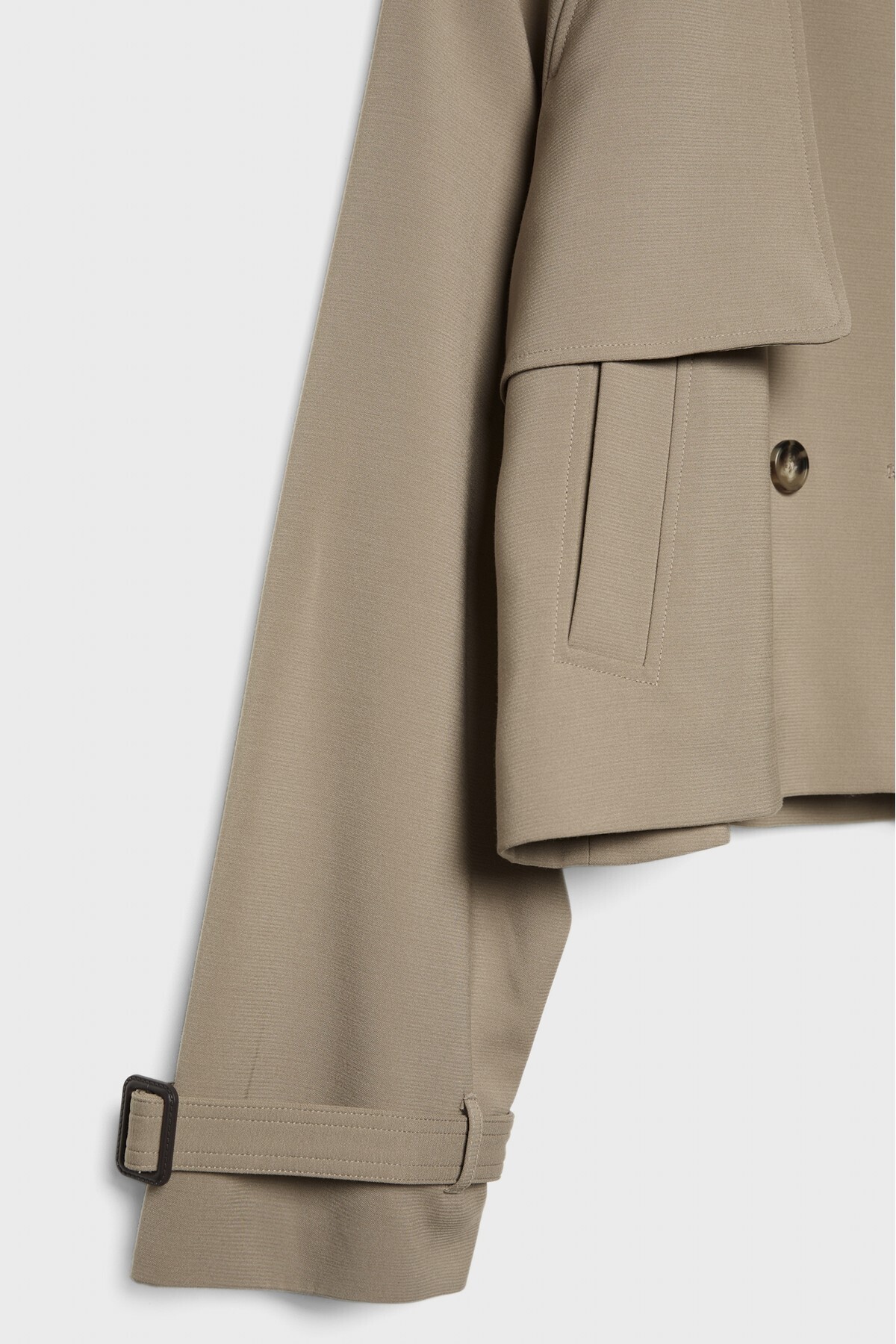 Önü kruvaze düğmeli, biyeli yan cepli, bant detaylı uzun kollu, katlı yaka, dökümlü, kısa trençkot.
