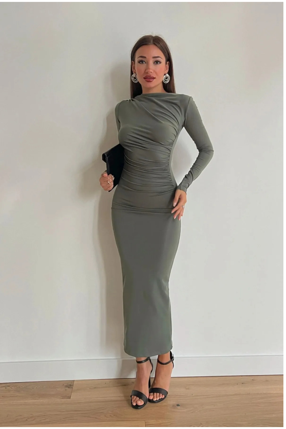 KADIN Uzun Kollu Drape Detaylı Malenkov Kadife Elbise