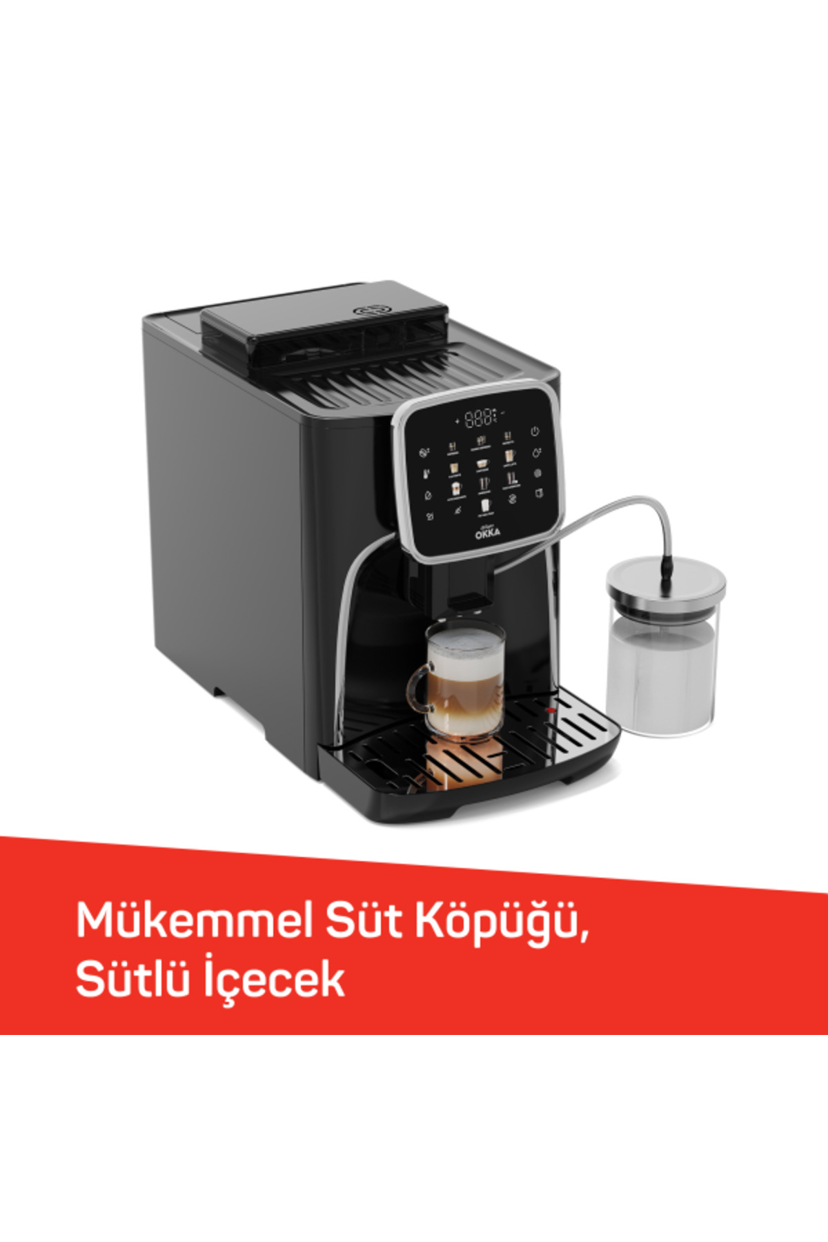 Arzum OKKA Espresso Pro M Tam Otomatik Espresso Makinesi, tek tuşla espresso, double espresso, flat white, ristretto, americano, soğuk americano, cappuccino, latte macchiato, caffe latte, süt köpüğü veya öğütülmüş kahve hazırlamanıza imkan tanır.