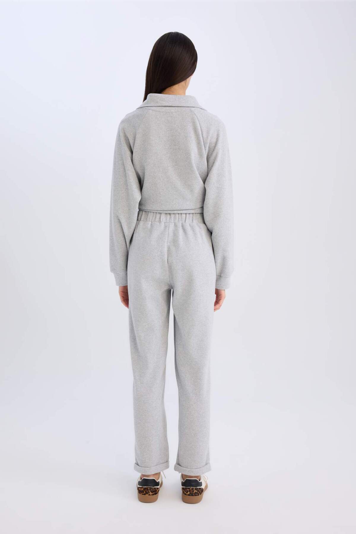 Şık ve rahat Regular Fit siyah pantolon, beli lastikli ve düz bağcıklı tasarımıyla öne çıkıyor.