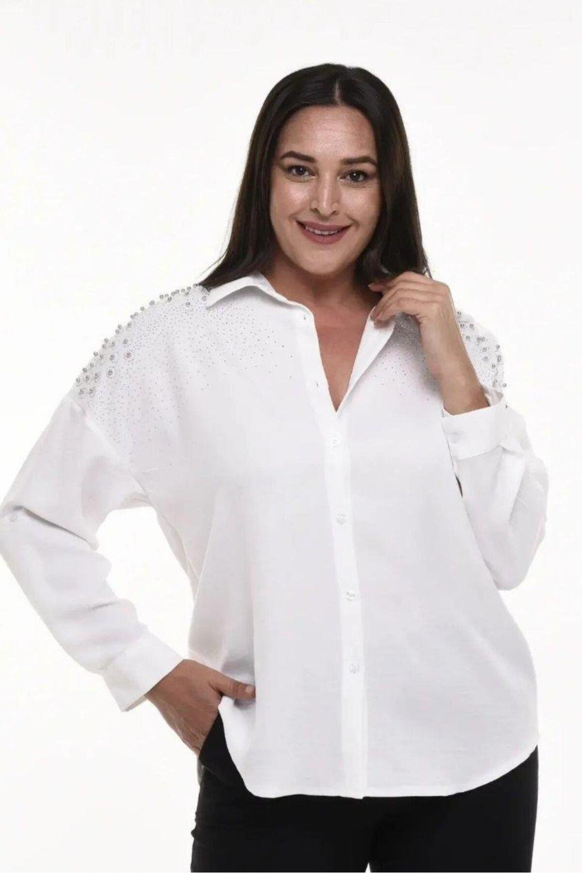Boncuk İşlemeli Aerobin Gömlek Büyük Beden Beyaz