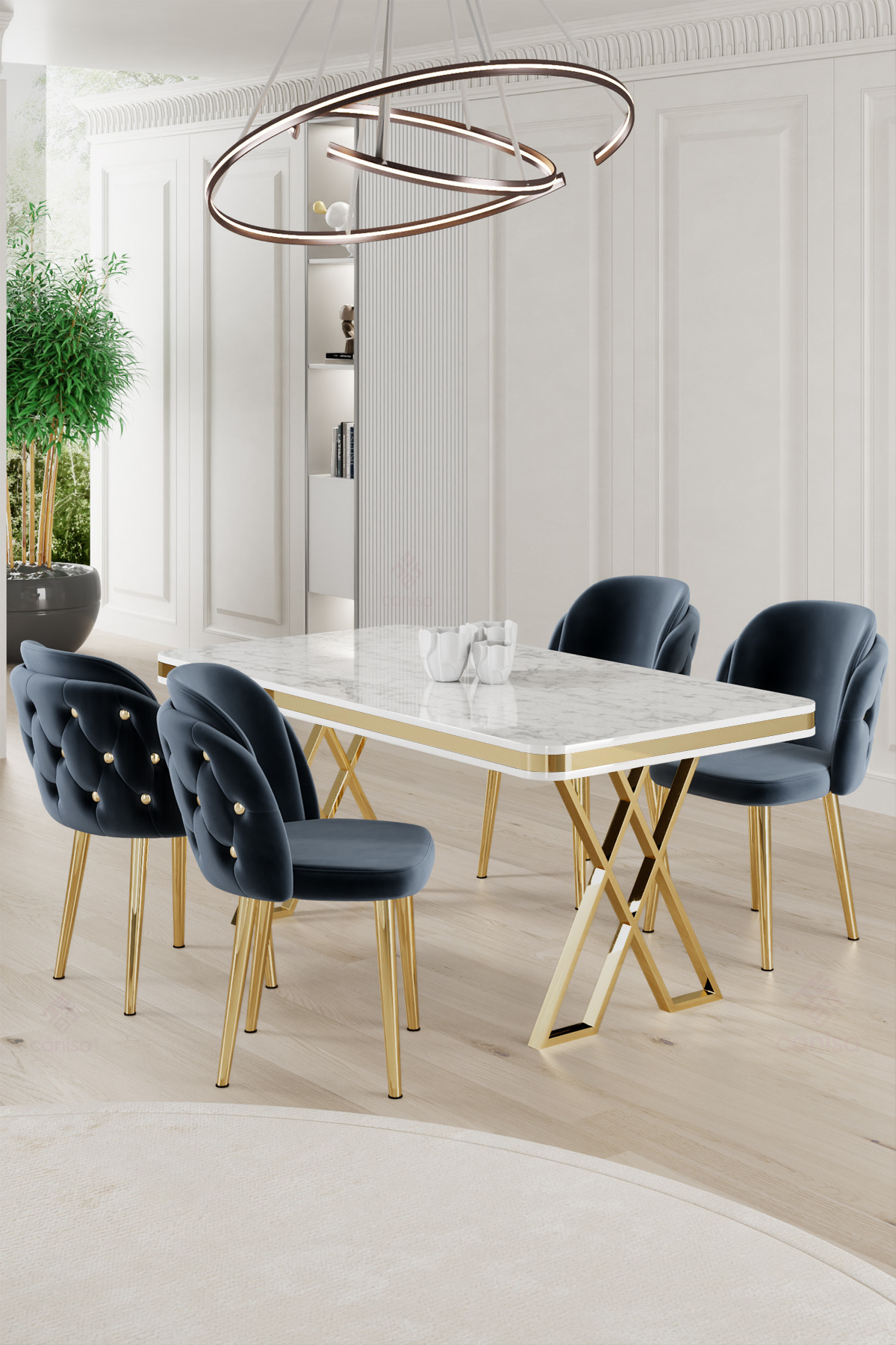 Rigel Serisi 80x130 Lak Panel Beyaz Mermer Desen Masa Takımı Gold Ayaklı 4 Cappucino Sandalye