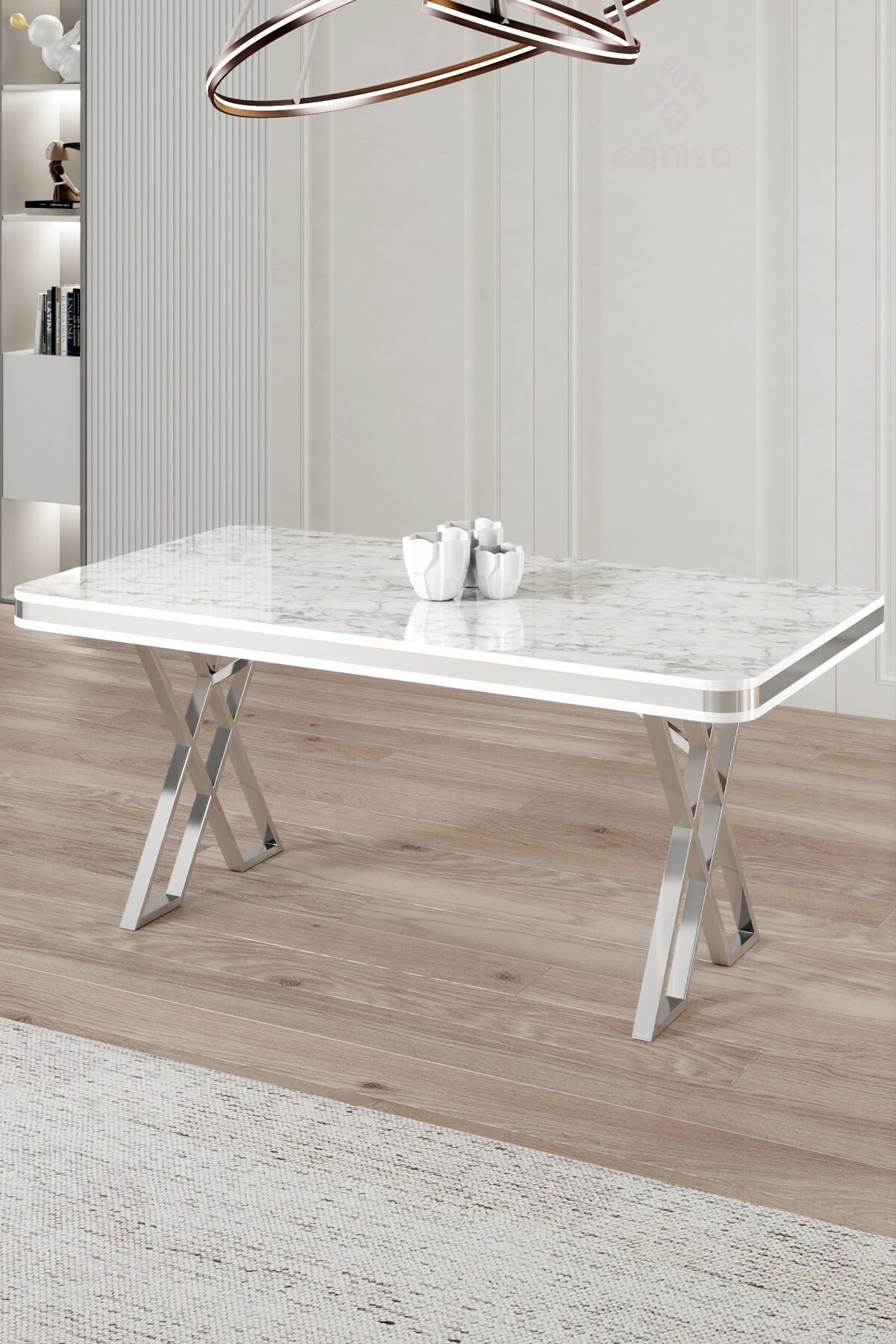 Vals Serisi 80x130 Lak Panel Sabit Masa Siyah Mermer Desen Krom Ayaklı