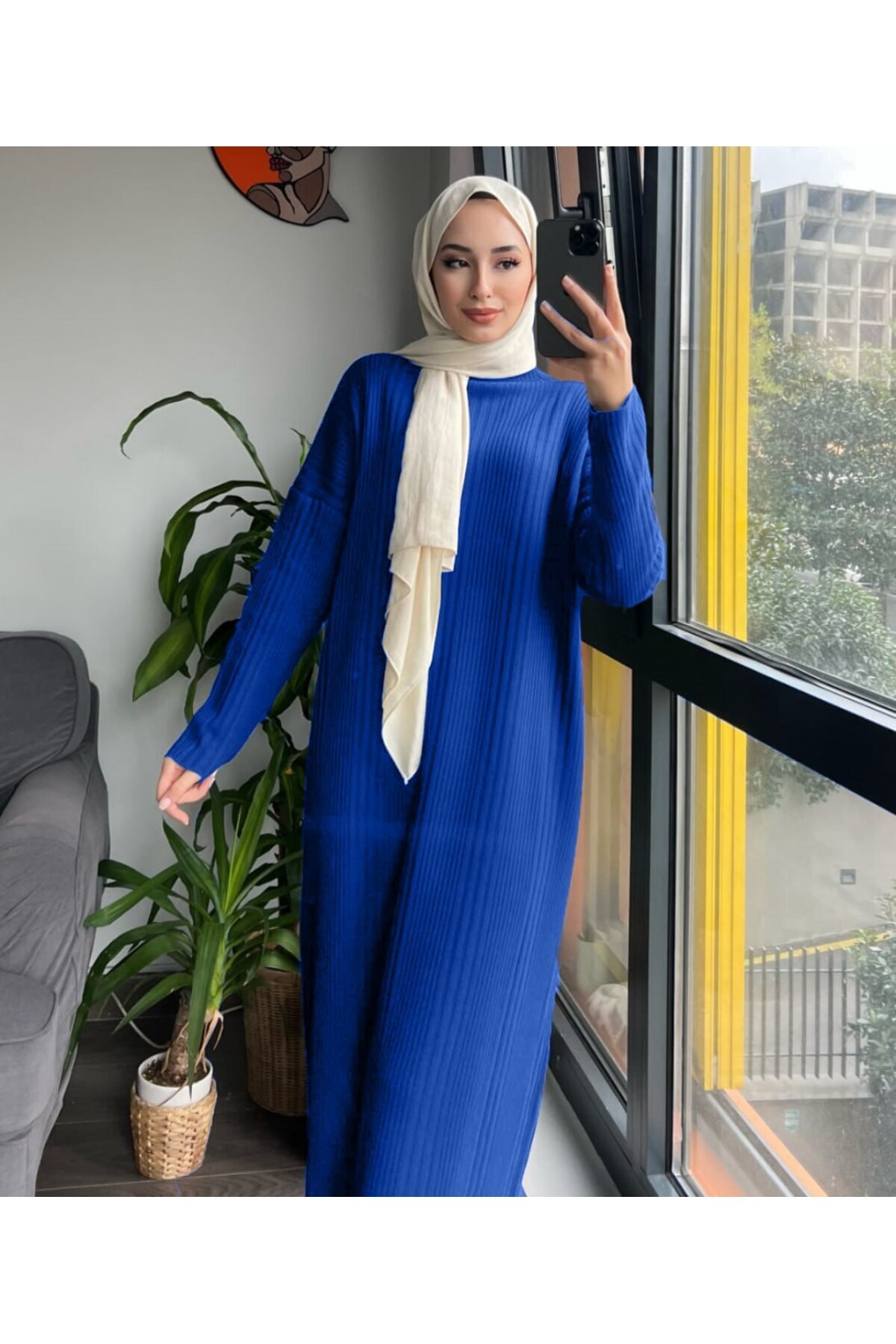 Oversize Bol Kesim Yarım Balıkçı Yaka Fitilli Triko Tesettür Elbise 38-44 Beden Arası
