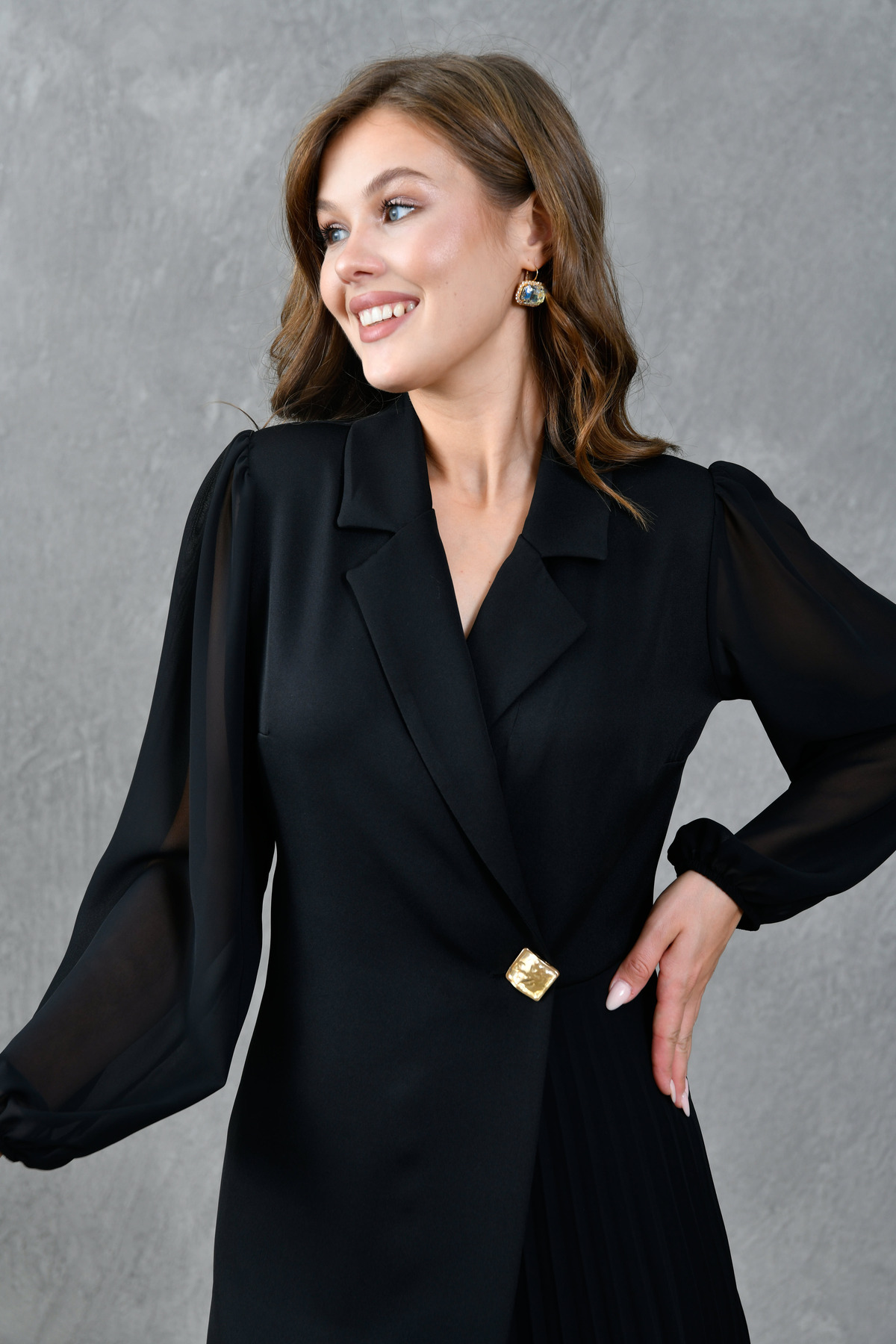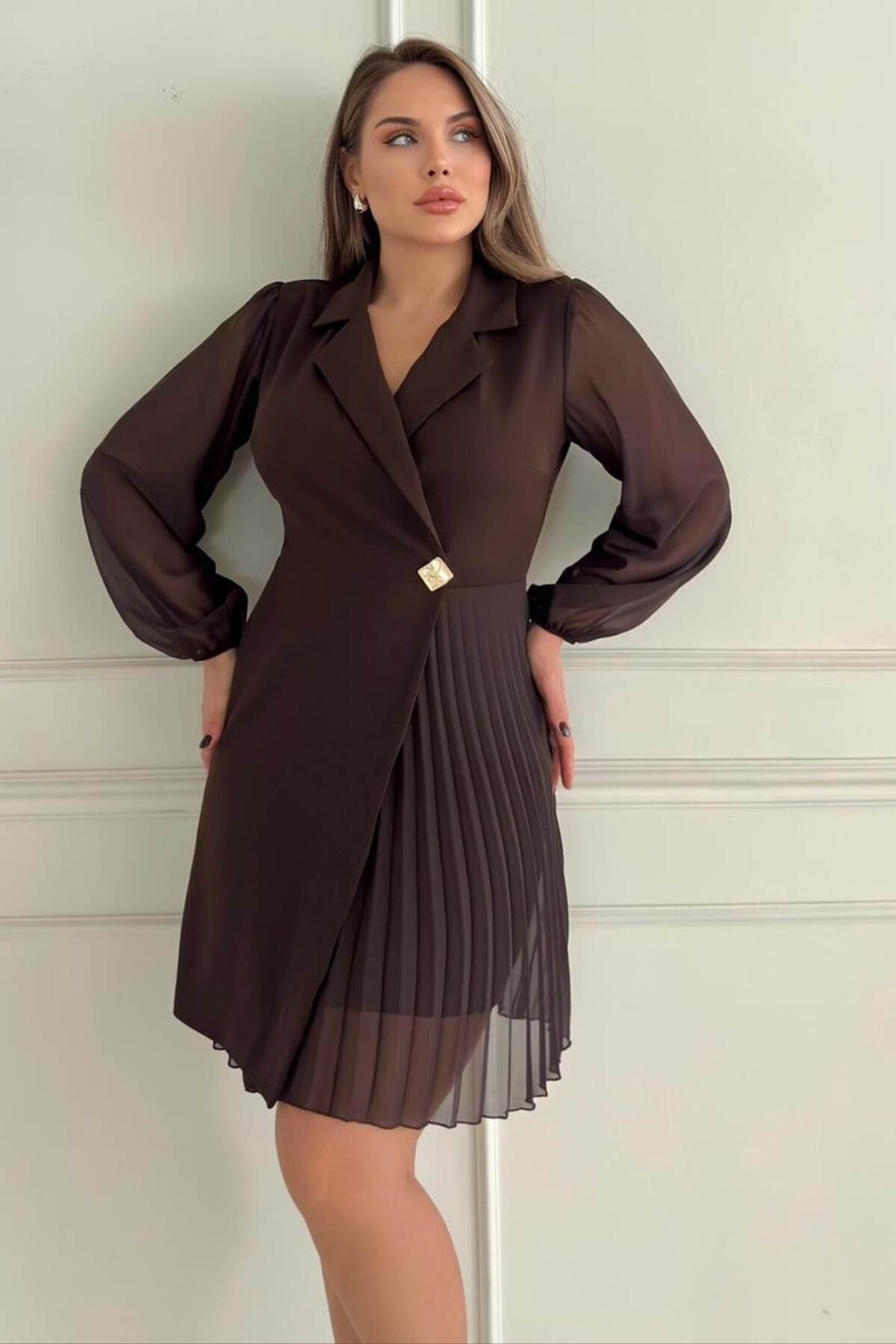 Ceket Yaka Düğme Detaylı Eteği Kolları Tül Piliseli Kadın Abiye Elbise 017