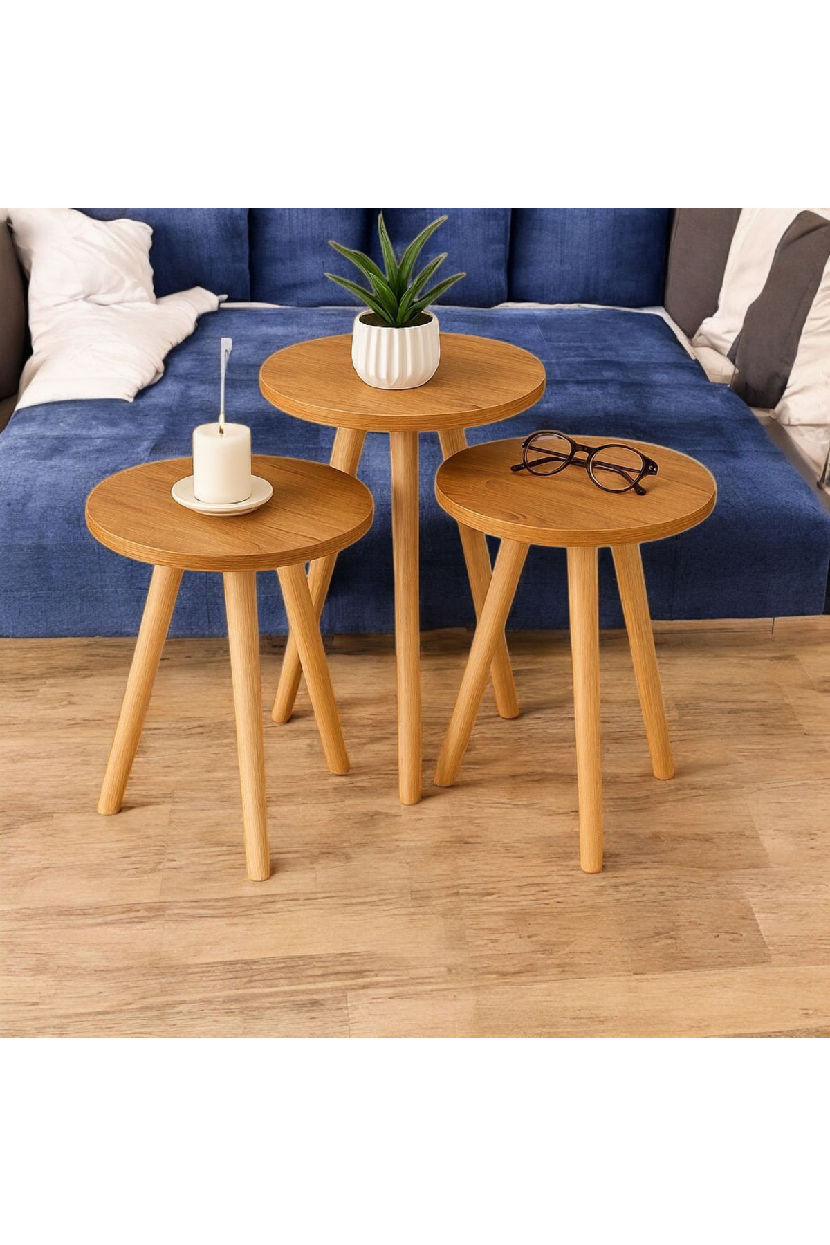 Sehpa çapı: 34 cm Ayak ölçüleri: 41 45 49CM ayakları %100 doğal ahşap malzemeden üretilmiştir.
