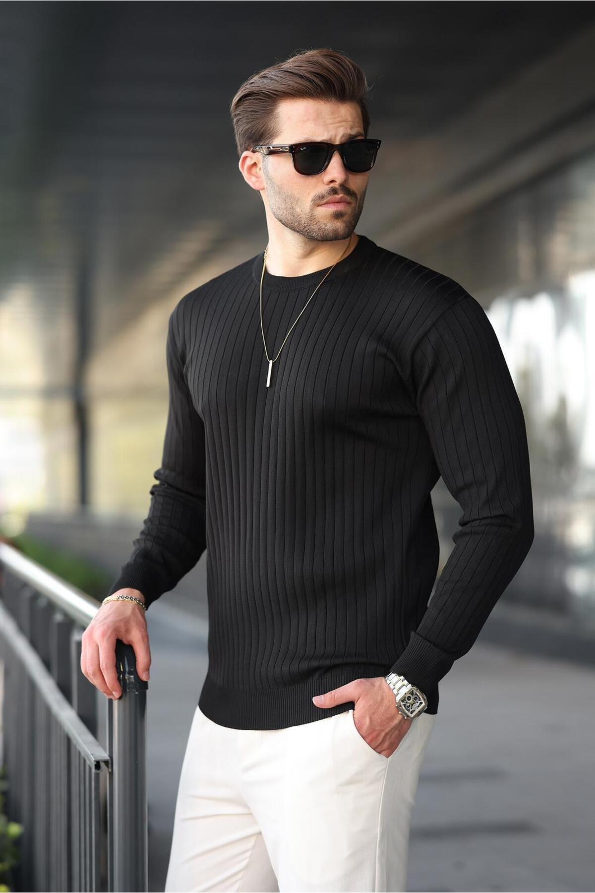 Siyah Bisiklet Yaka Çizgili Uzun Kollu Kazak E7273