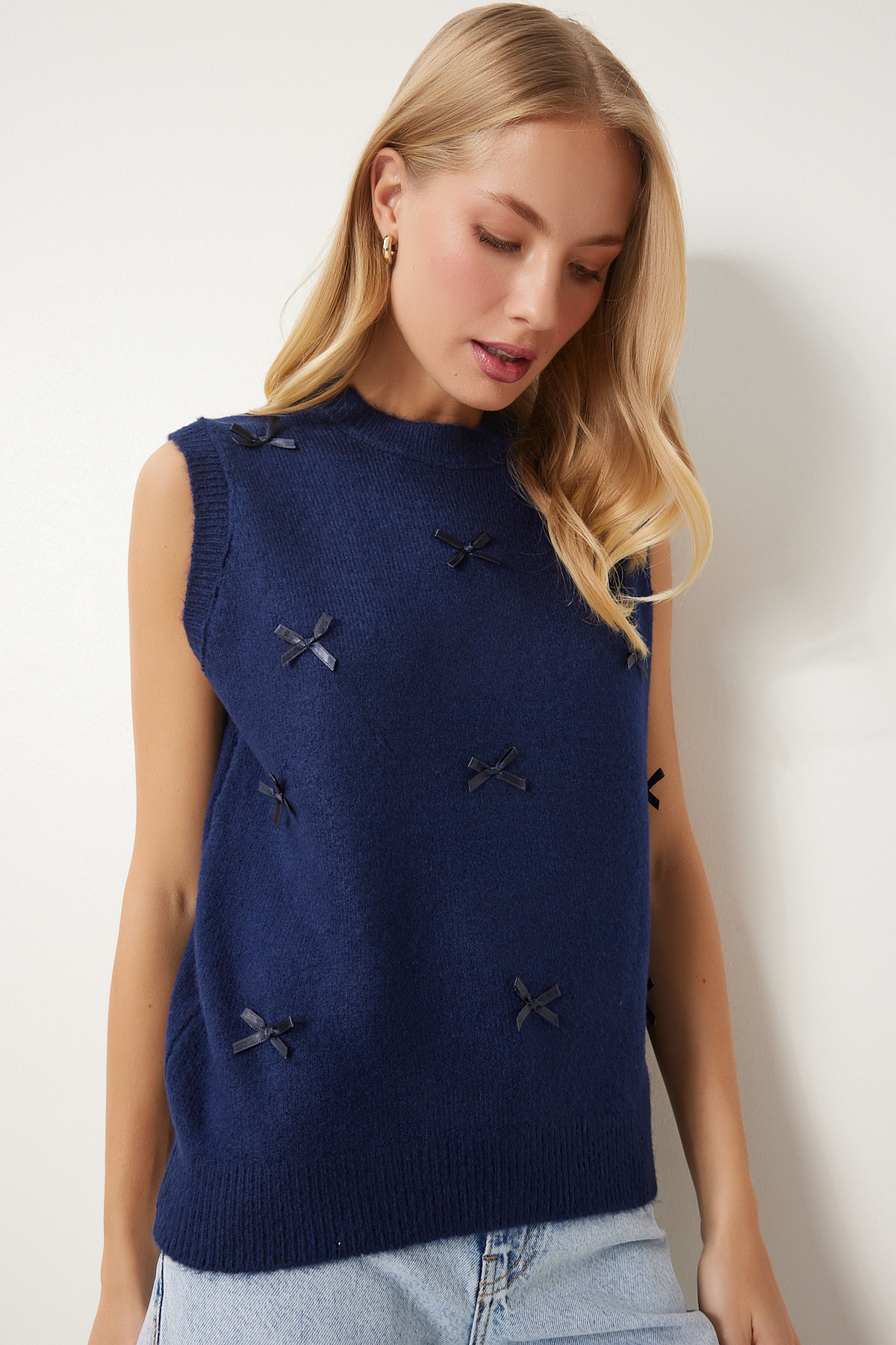 Kolsuz, bisiklet yaka, fiyonklu, esnek yapılı triko süveter.