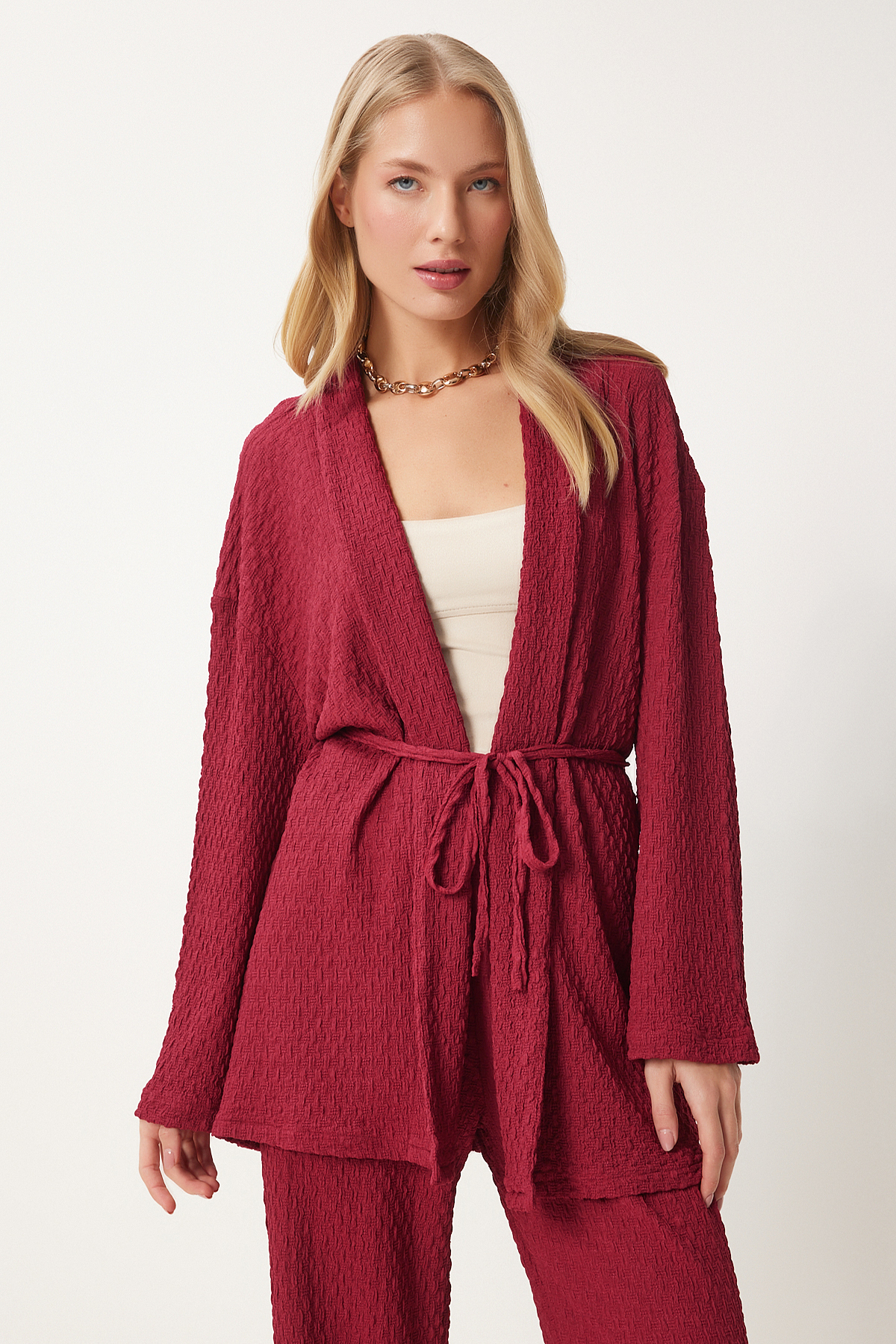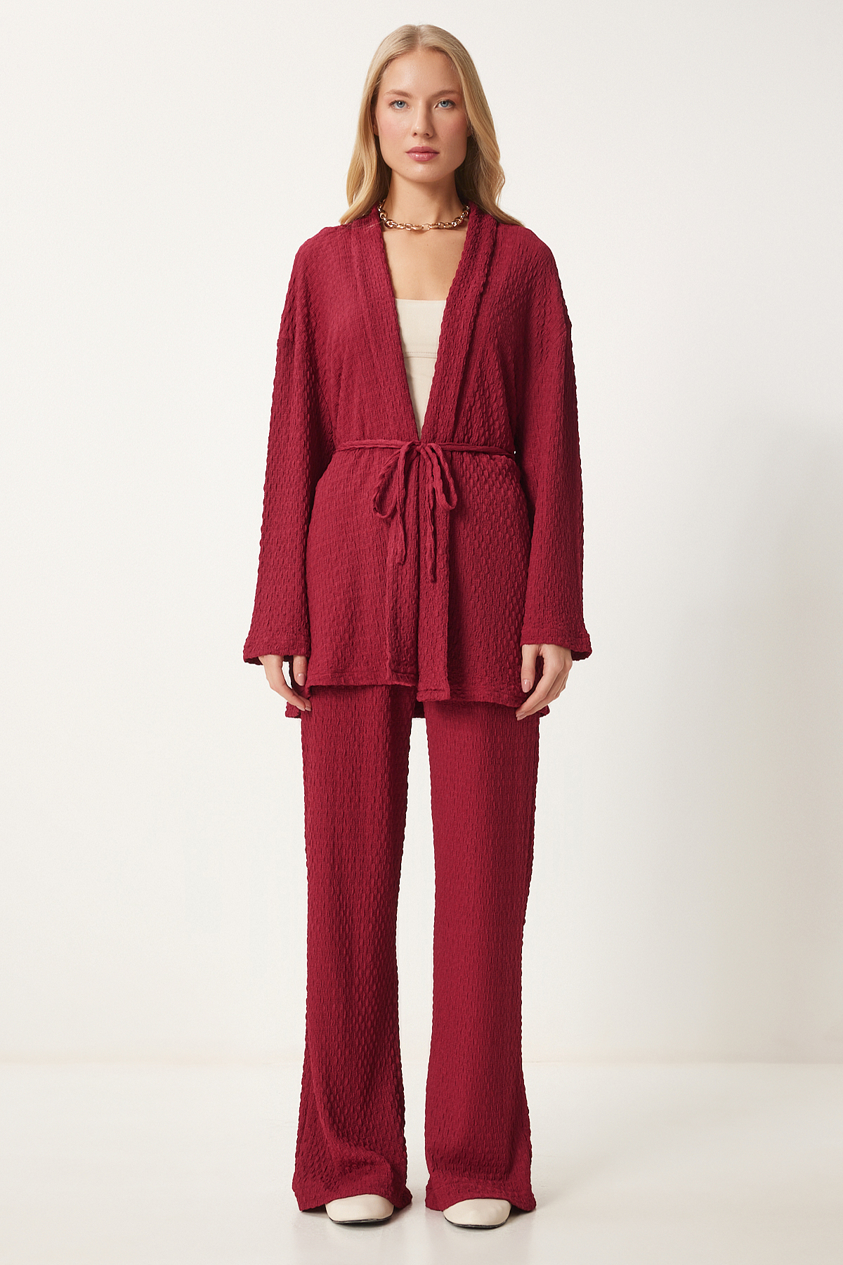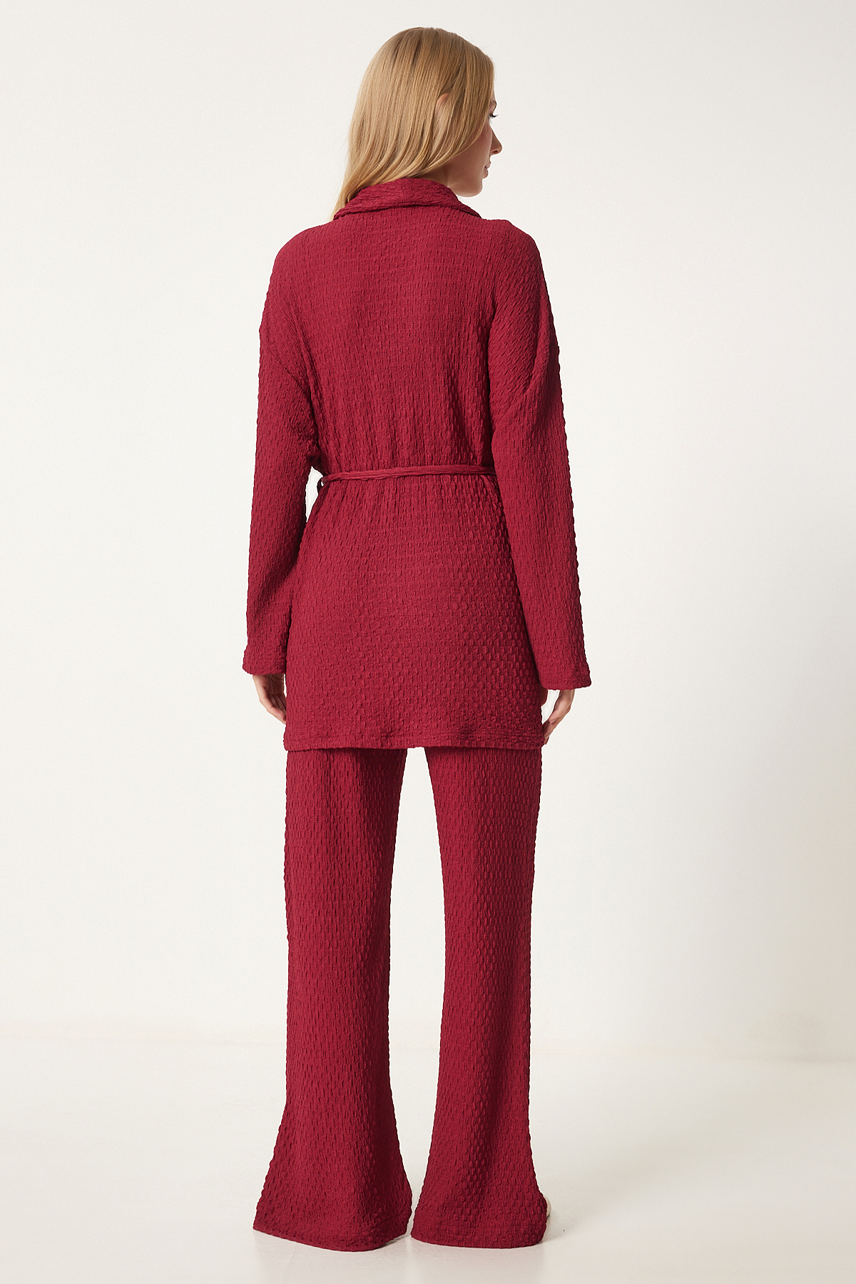 Dokulu, mevsimlik, şal yaka, kuşaklı hırka ve elastik bel pantolondan oluşan örme takım