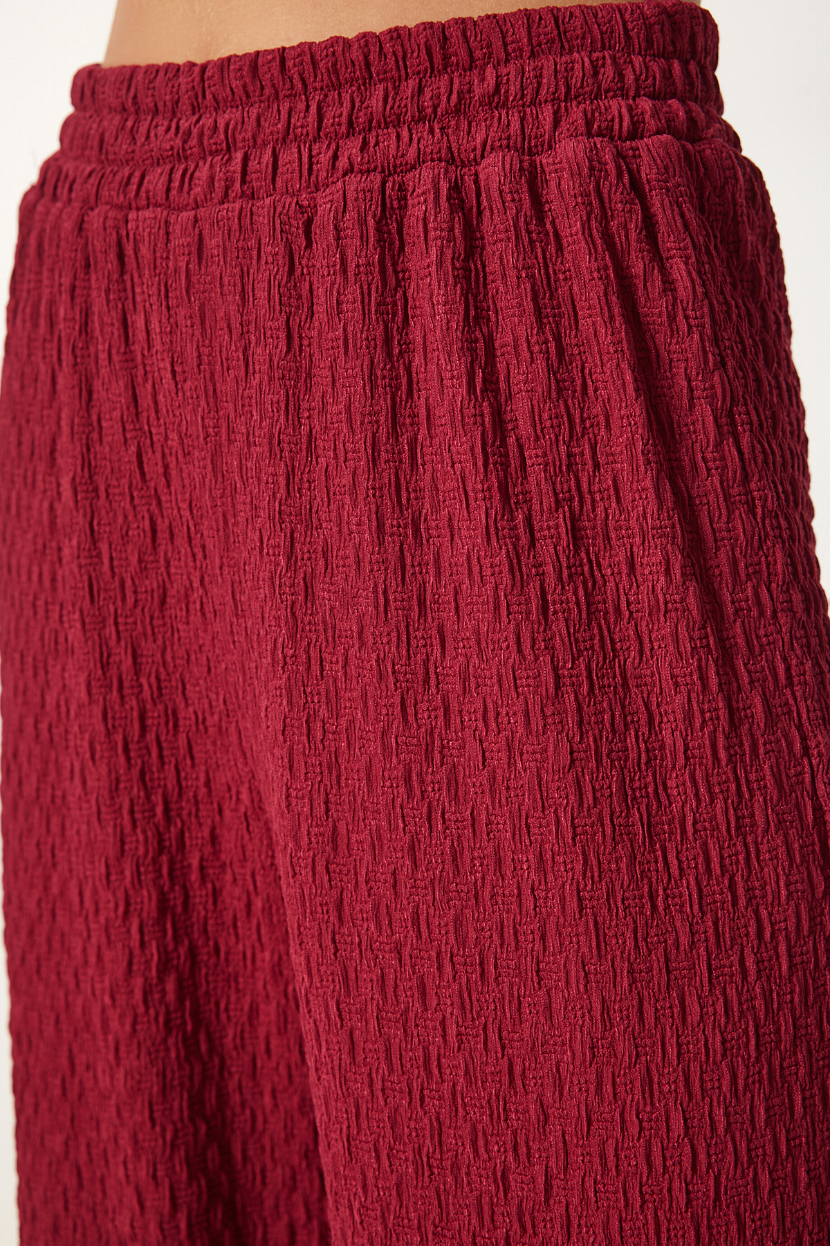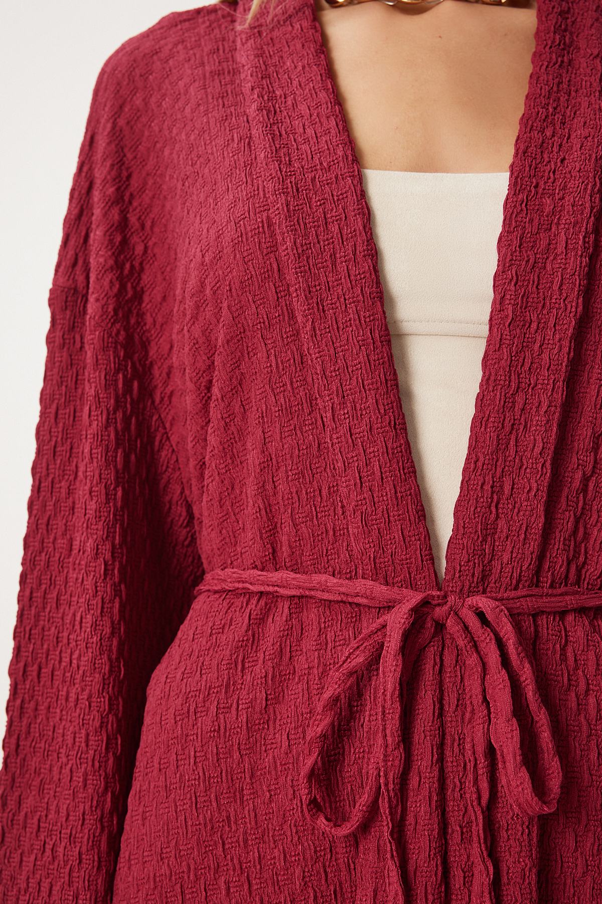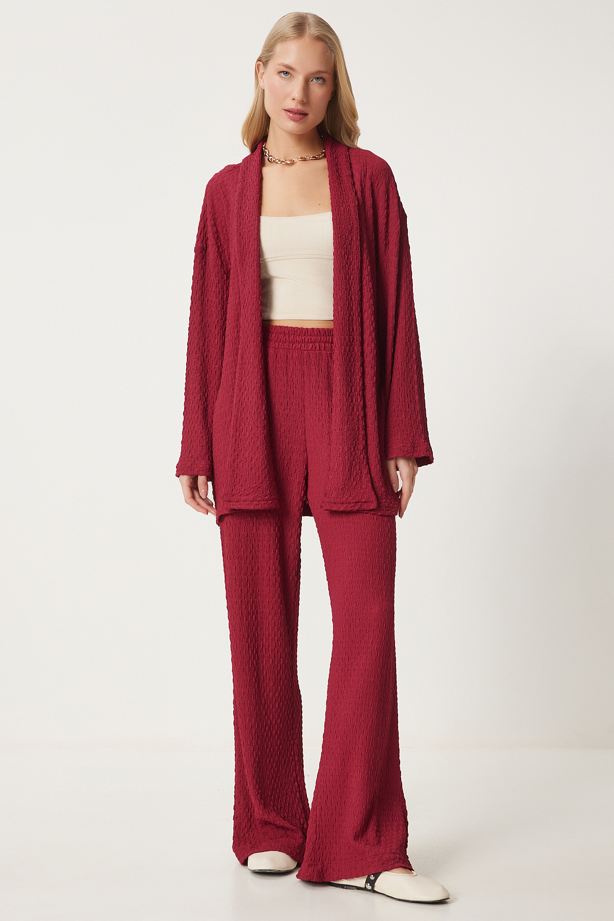 Dokulu, mevsimlik, şal yaka, kuşaklı hırka ve elastik bel pantolondan oluşan örme takım