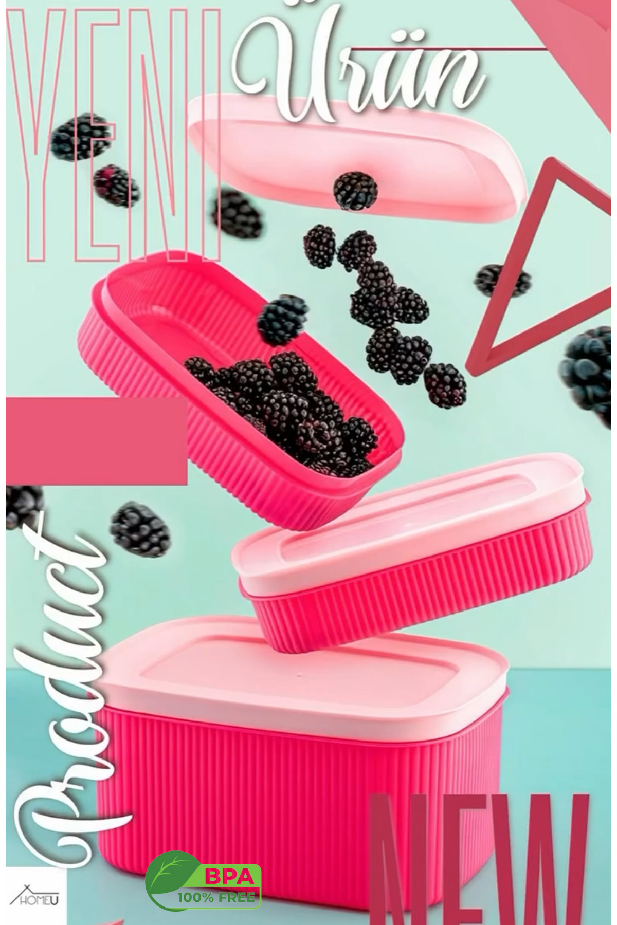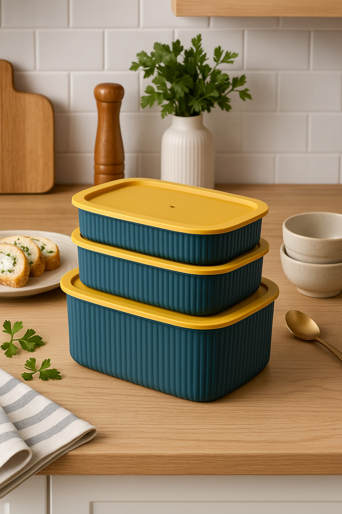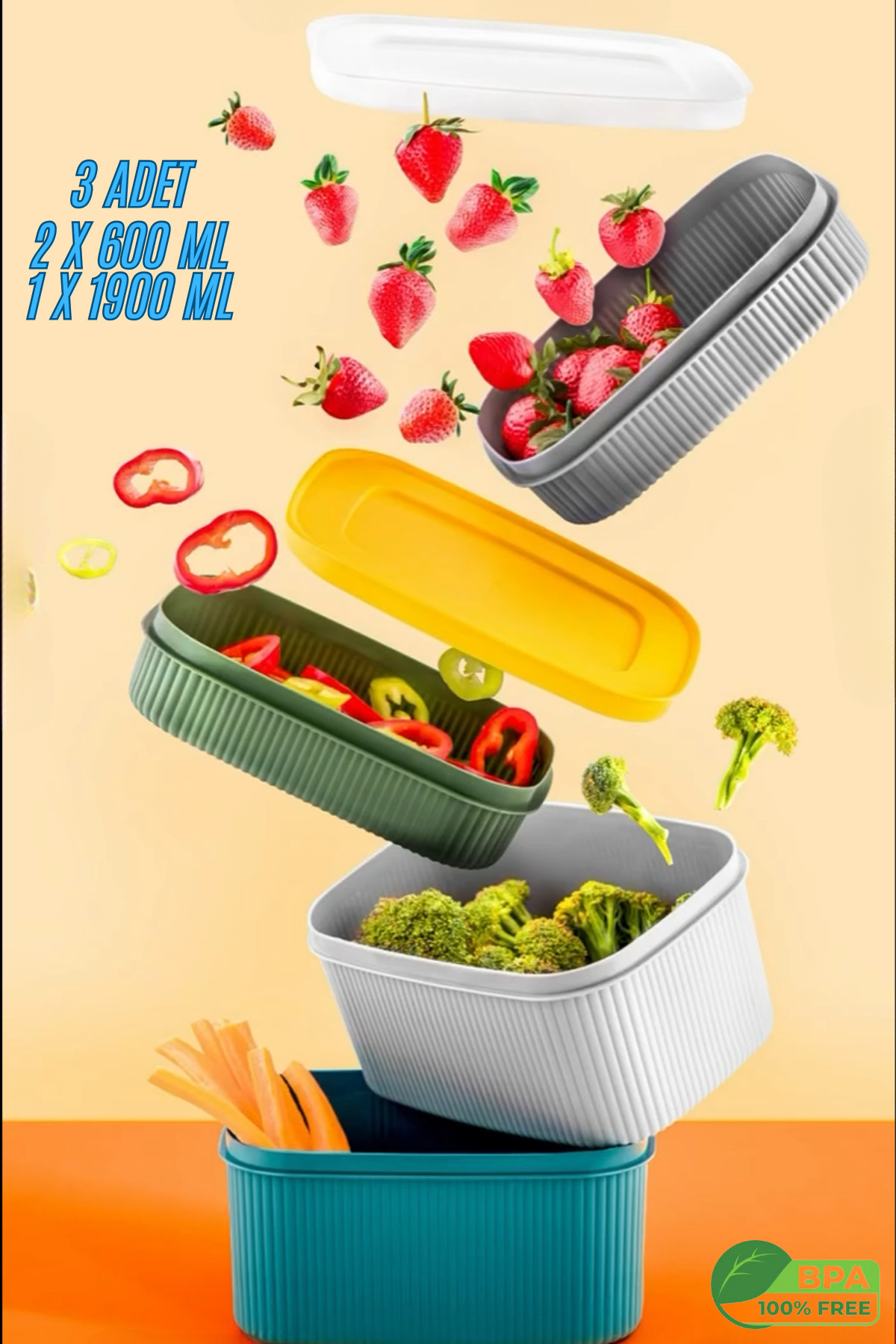 - Üç farklı boyutta plastik kapaklı saklama kabı, mutfakta düzenli bir depolama çözümü sunar.