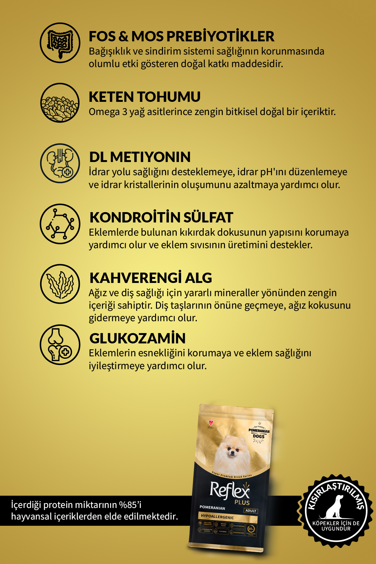 10 aylıktan büyük, Pomeranian ırkı köpeklere uygun tam ve dengeli formüle edilmiş, süper premium kuru köpek mamasıdır.