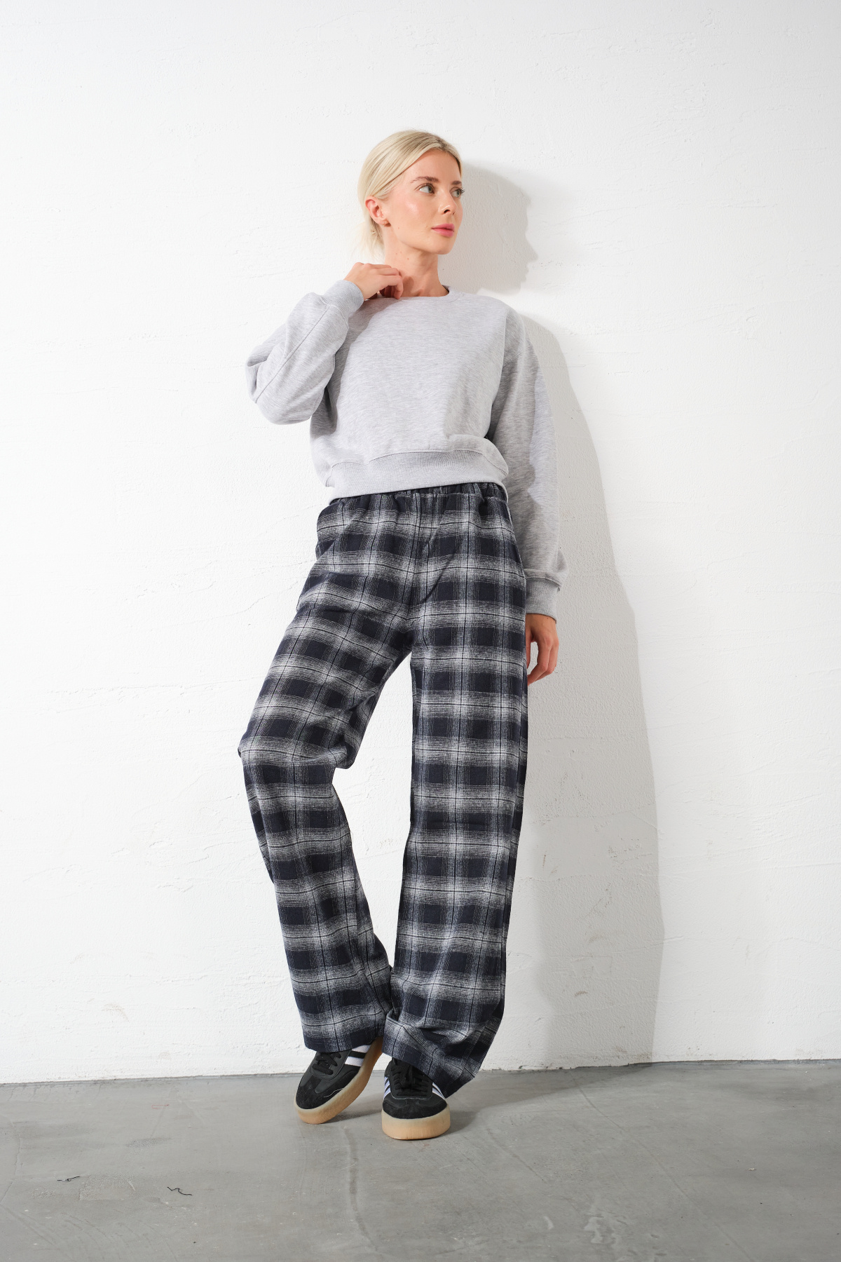 Siyah Ekoseli Flanel Yüksek Bel Pijama Altı Rahat Kesim Geniş Paça Pamuklu Kadın Pantolon