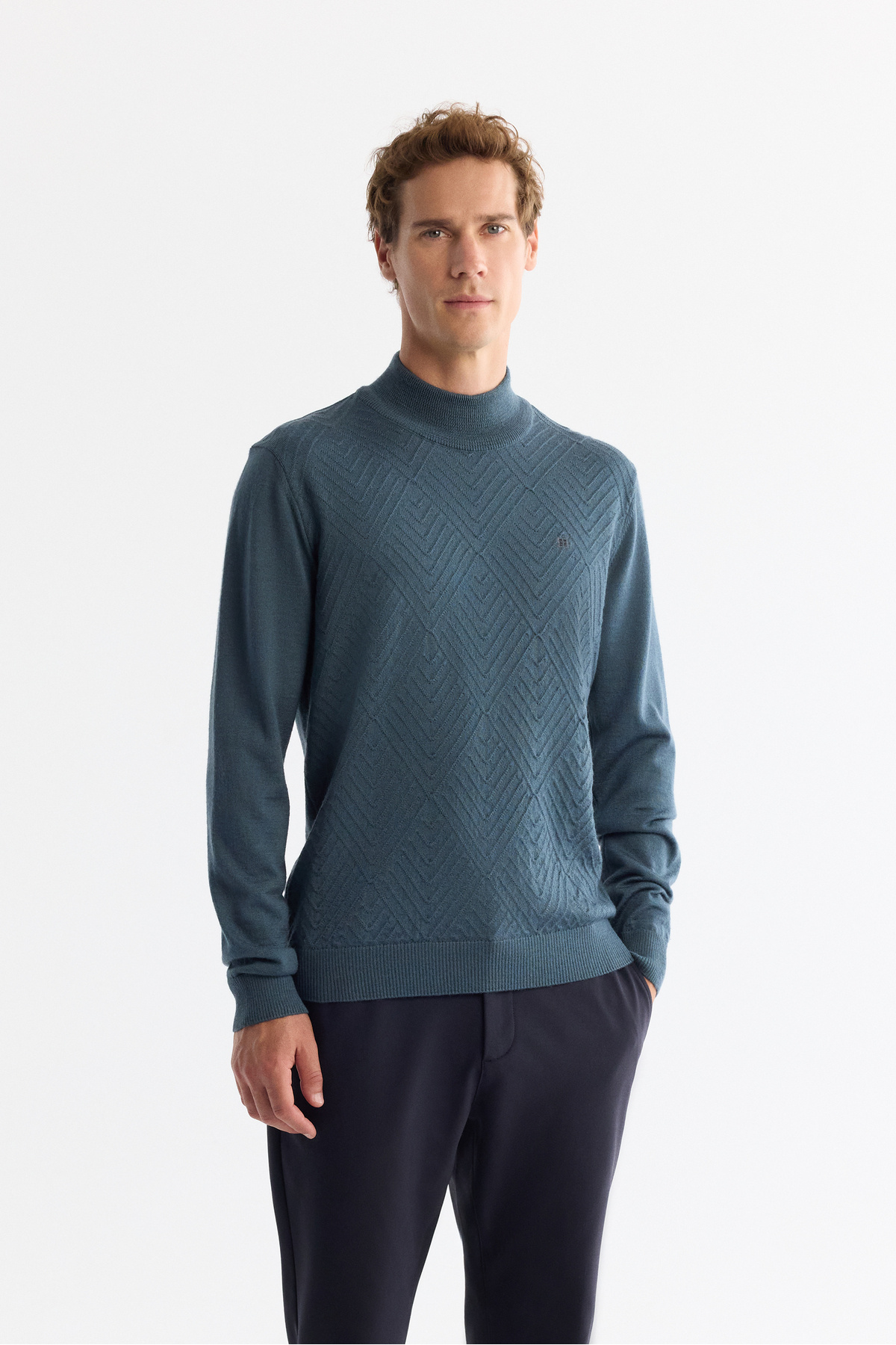 Yarım balıkçı yaka, Göğüste branding nakışlı, Yaka kol ve etek ucu rib örgü, Ön bedeni jakarlı, Yün karışımlı, Sıcak tutan, Regular Fit, Kazak