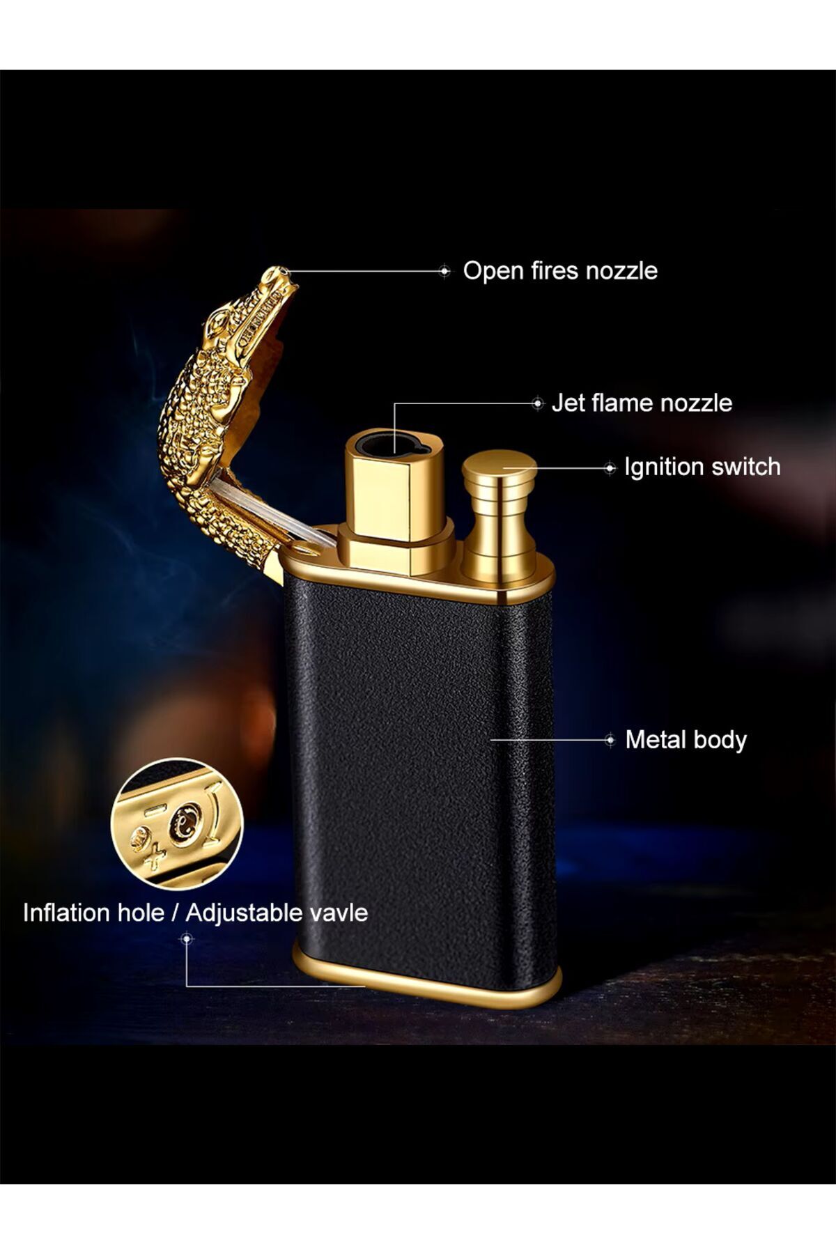 Kişiye özel isimli timsah başlı çift ateşli çakmak Özel kutusunda gönderilmektedir Metal malzemeden üretilmiştir.