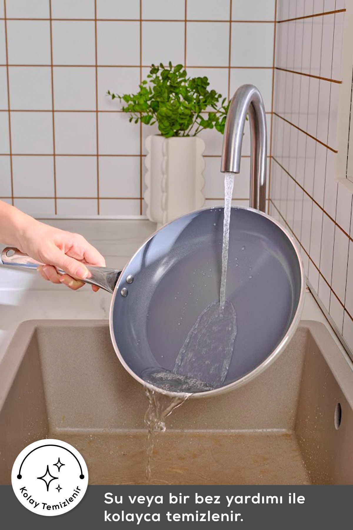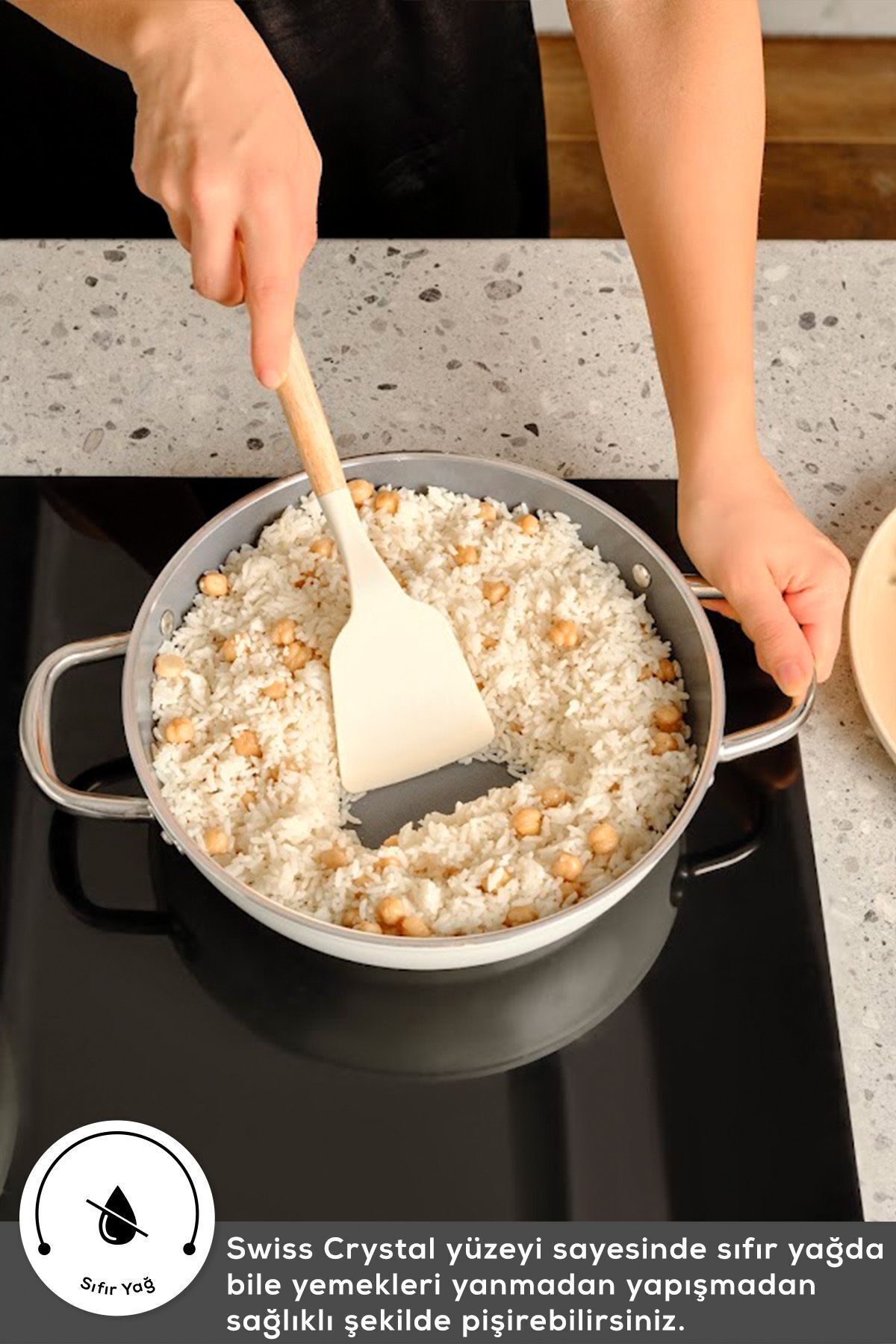 PFAS ve Zararlı Kimyasallar İçermez: Swiss kristallerden oluşan yapışmaz yüzeyi insan sağlığını tehlikeye sokan “PFAS” gibi zararlı kimyasal maddeler içermez.