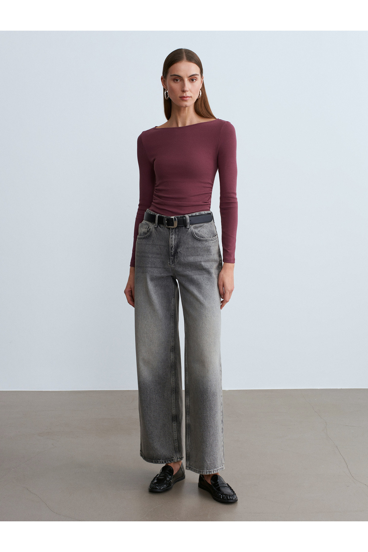 31401 Büzgülü Kayık Yaka Top-Koyu Kahve