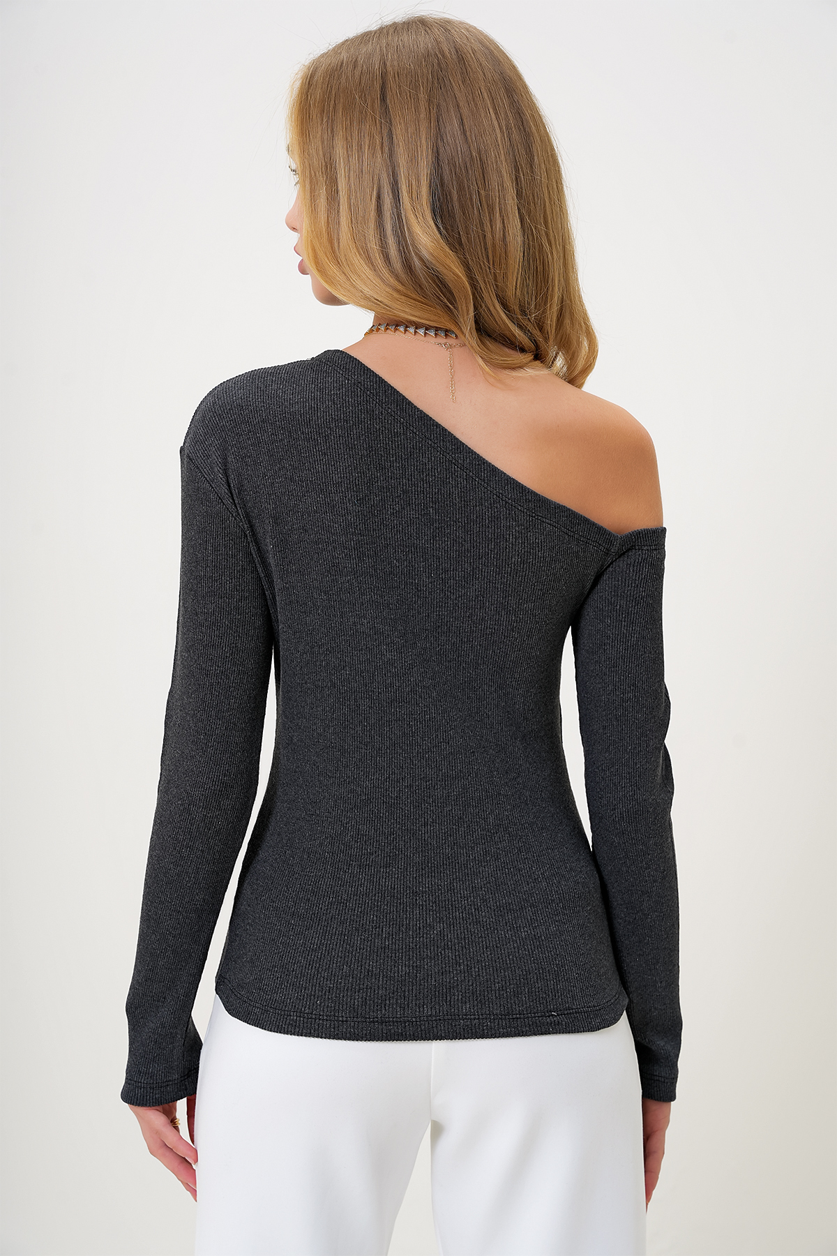 Kadın Antrasit Kayık Yaka Tek Omuzu Açık Kaşkorse Bluz ALC-X13068