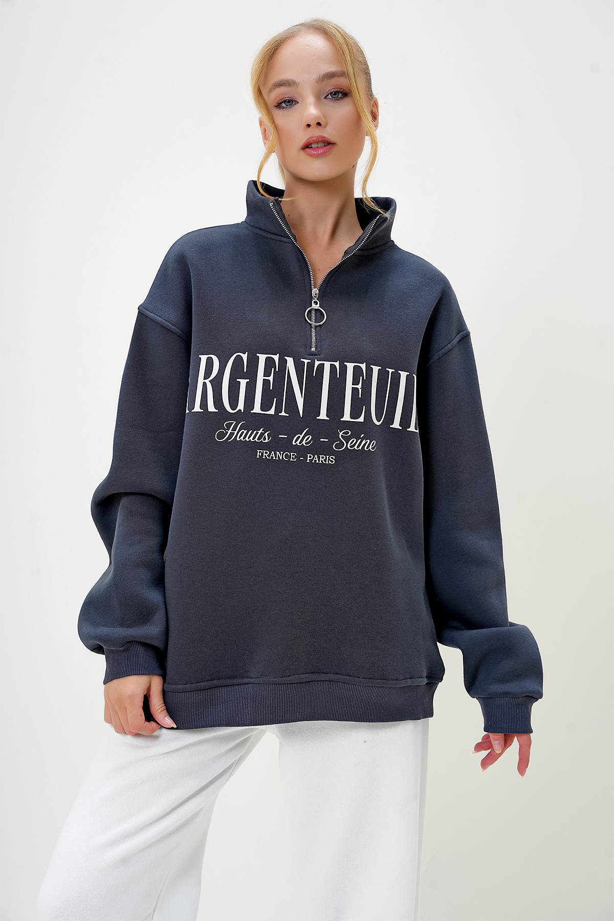 Kadın Antrasit Yarım Balıkçı Yaka Önü Yazı Baskılı İçi Şardonlu Fermuarlı Sweatshırt ALC-X13086