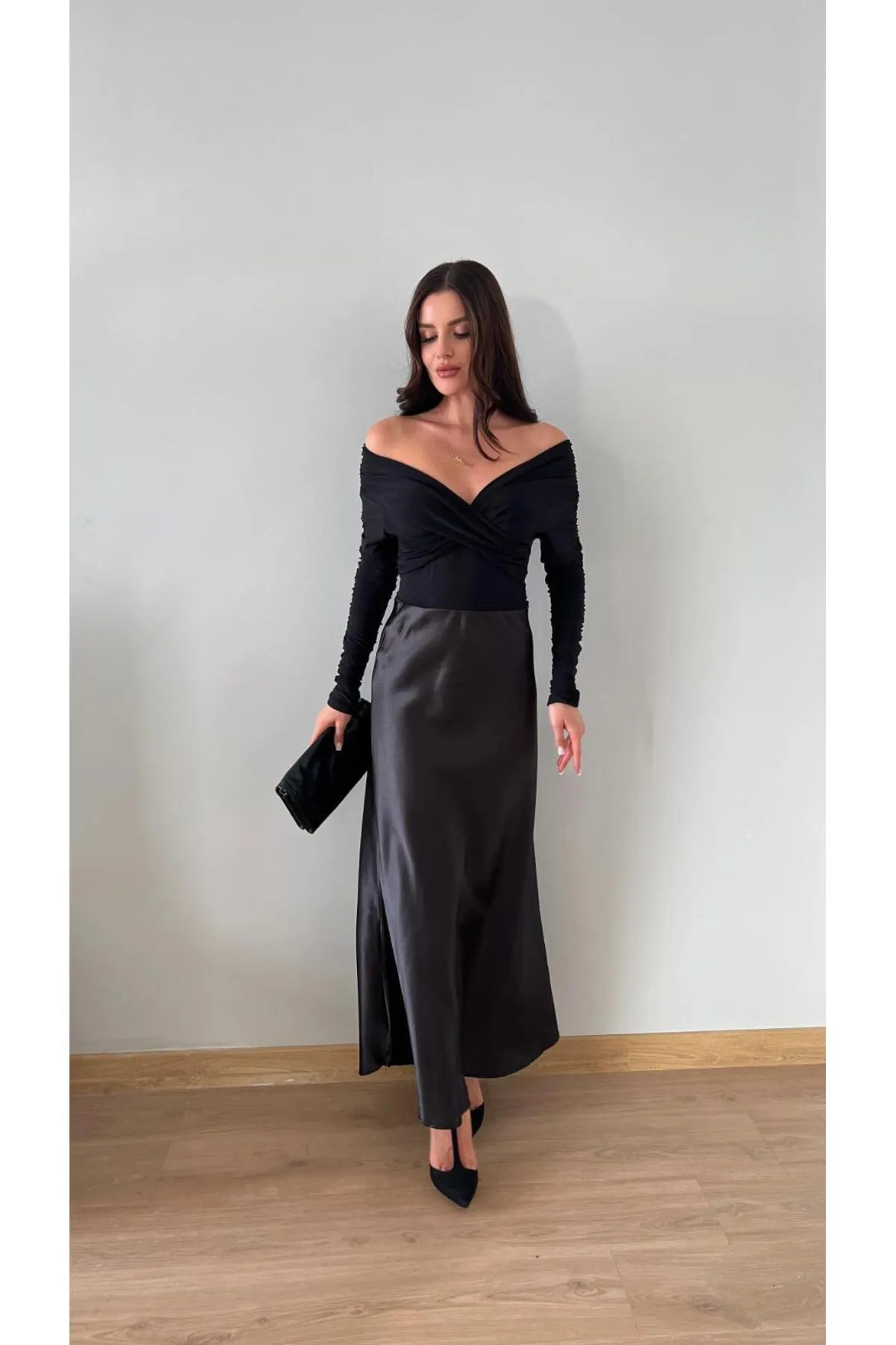 - Şıklığı ve rahatlığı bir arada sunan siyah parlak saten etek, günlük kullanımda da özel günlerde de tercih edebileceğiniz ideal bir seçenektir.