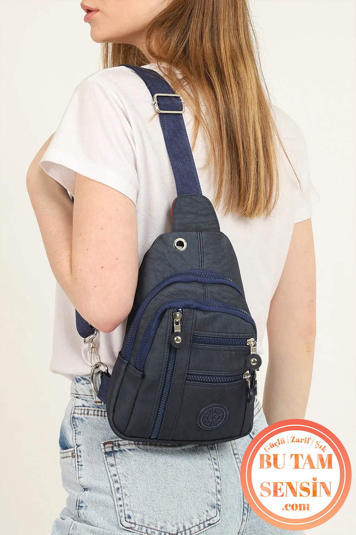 Lacivert Unisex Su Geçirmez Krinkıl Kumaşlı Fermuarlı 5 Bölmeli Çapraz Body Bag Vücut Çantası