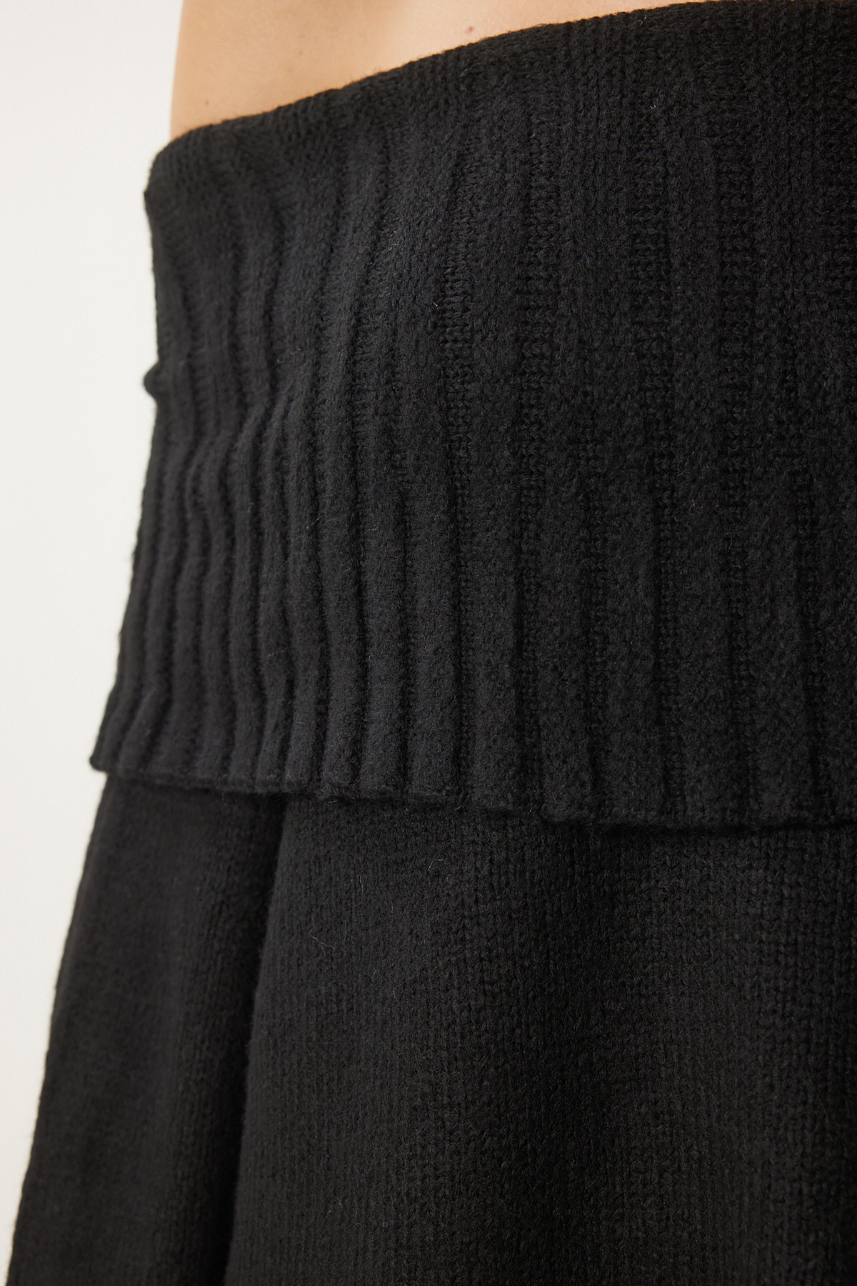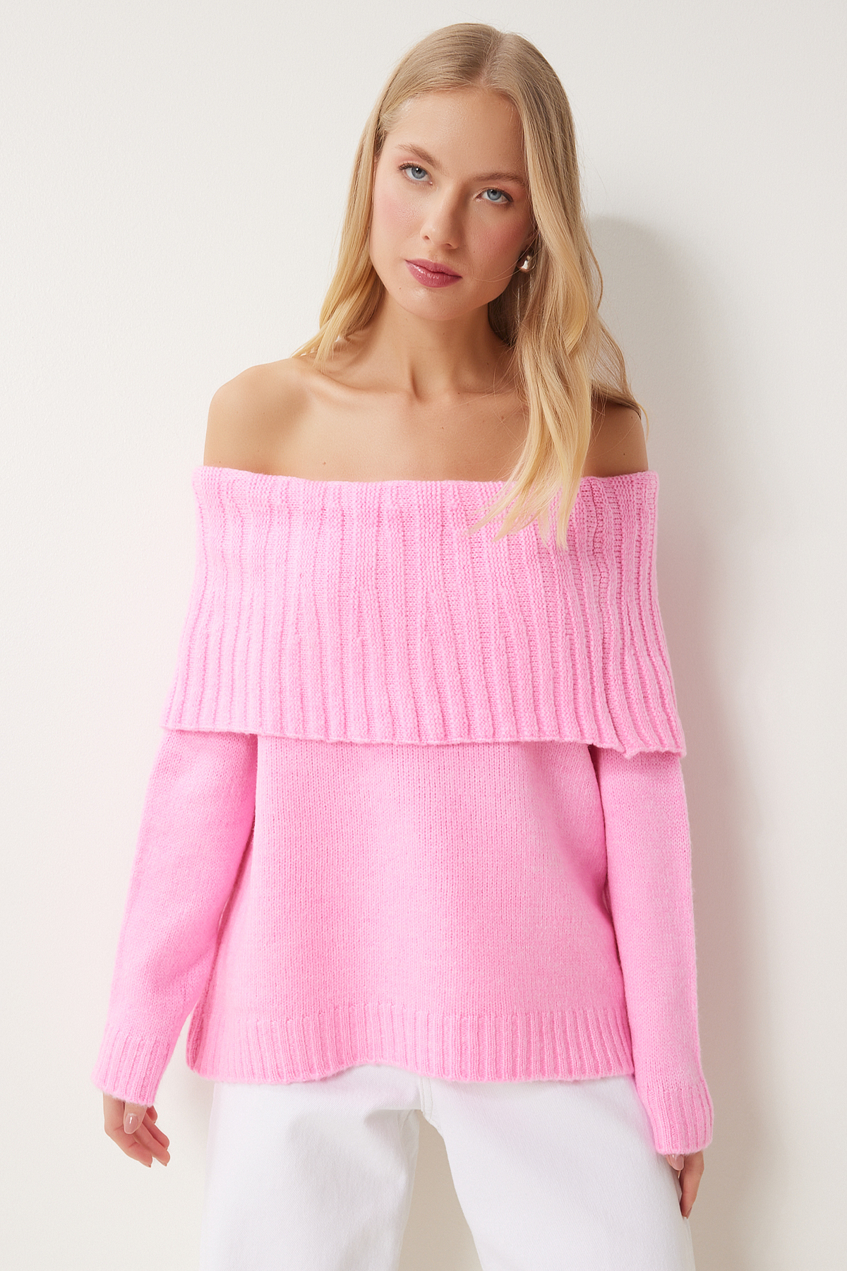 Madonna yaka, düşük omuzlu, esnek yapılı, çizgili triko kazak