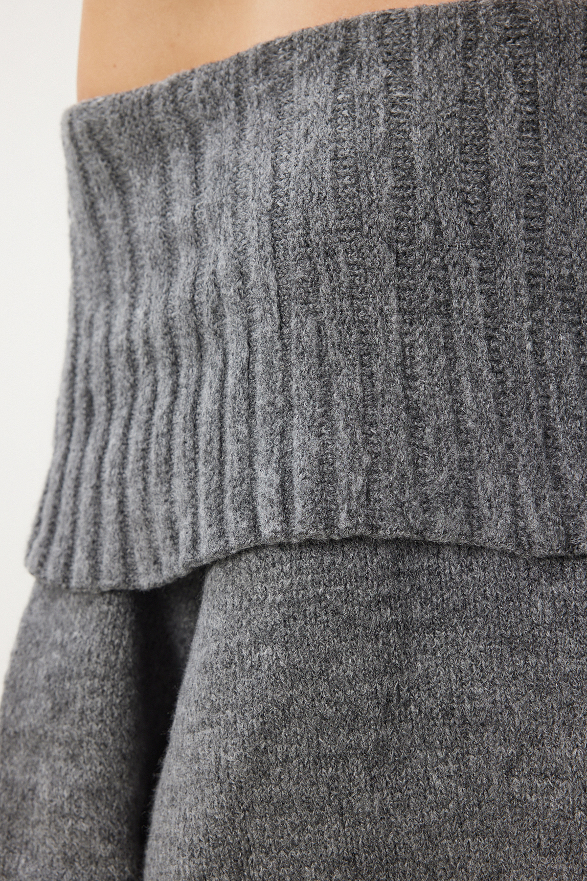 Madonna yaka, düşük omuzlu, esnek yapılı, çizgili triko kazak