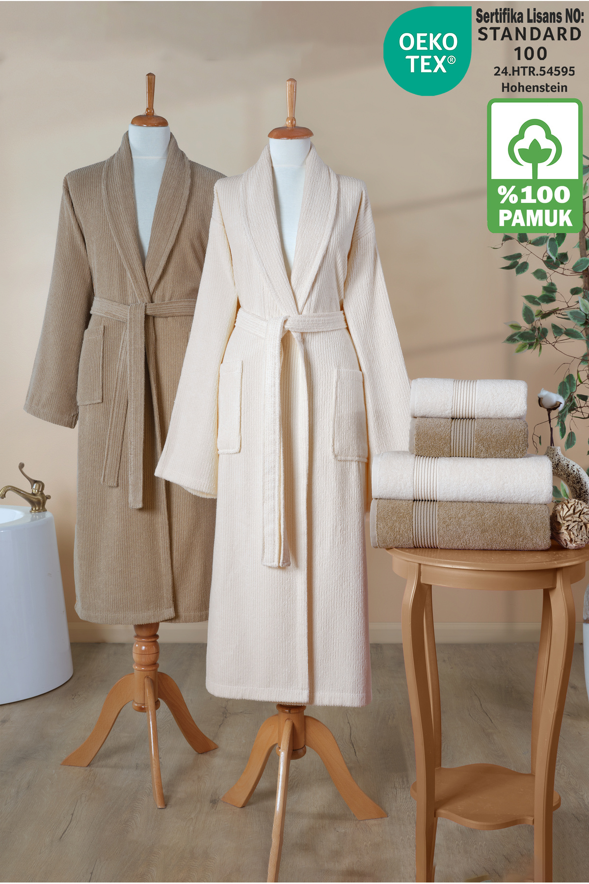 Bornozlar şalyakalı olup 360 gr/m², kafa havluları 450 gr/m² sık dokunmuş, yüksek emicilik ve yumuşaklık sunan havlu kumaşındandır.
