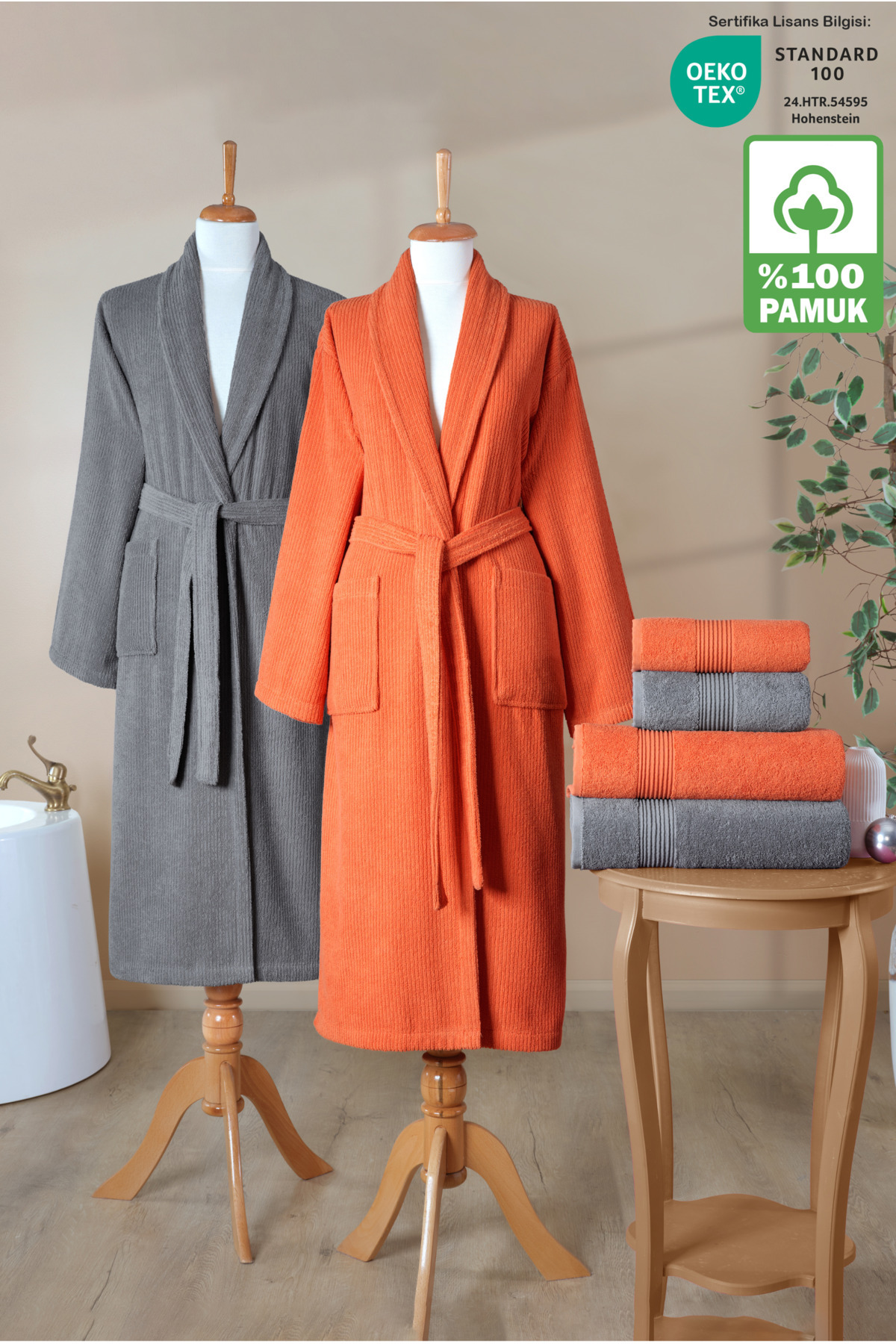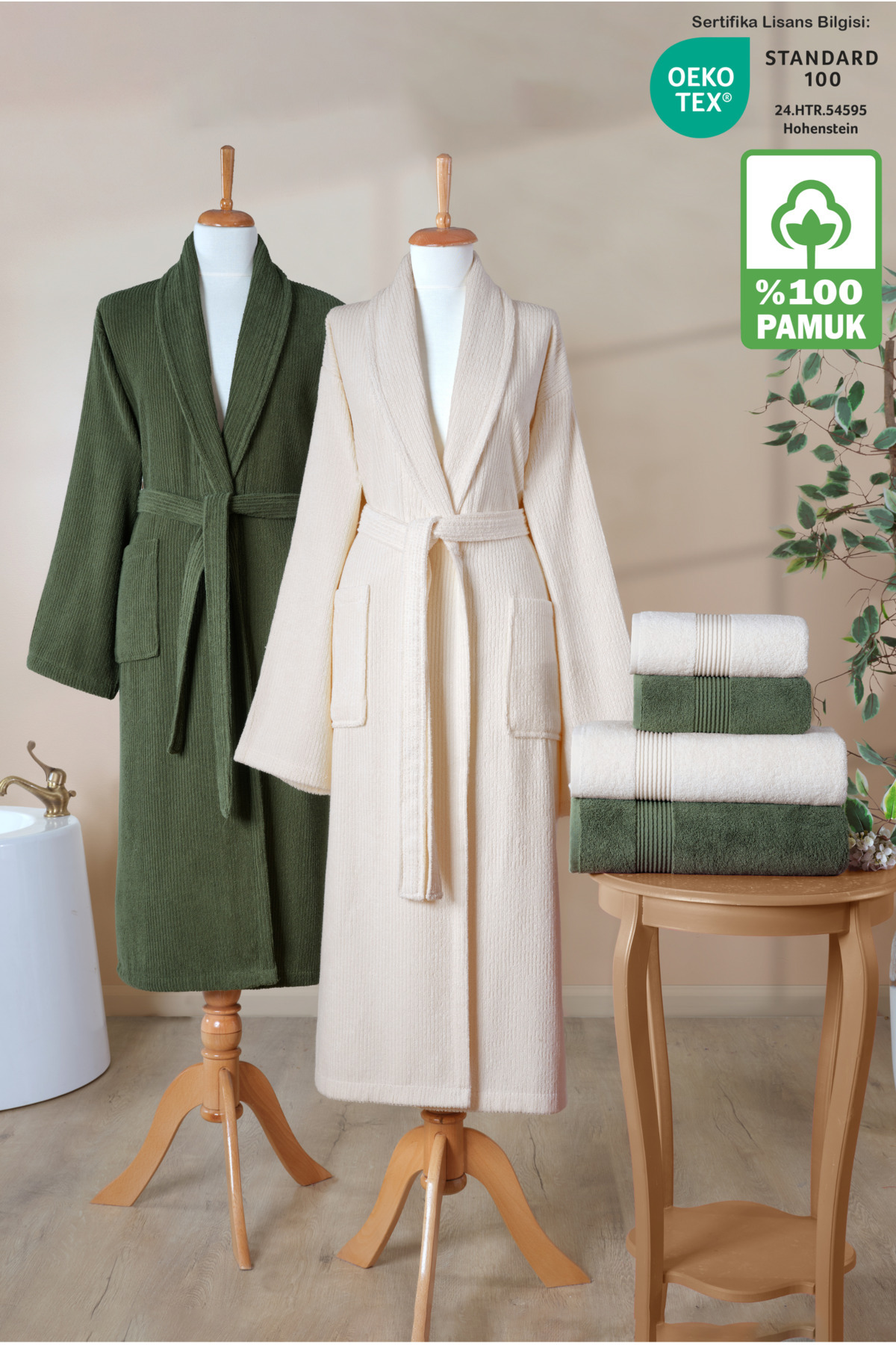 Paket İçeriği: Bornoz Seti içinde 2 adet kadın ve erkek bornozu, 2 adet çizgili bordürlü (50x90cm) kafa havlusu ve 2 adet (70x140) cm vücut havlusu olmak üzere toplamda 6 parça ürün bulunur.
