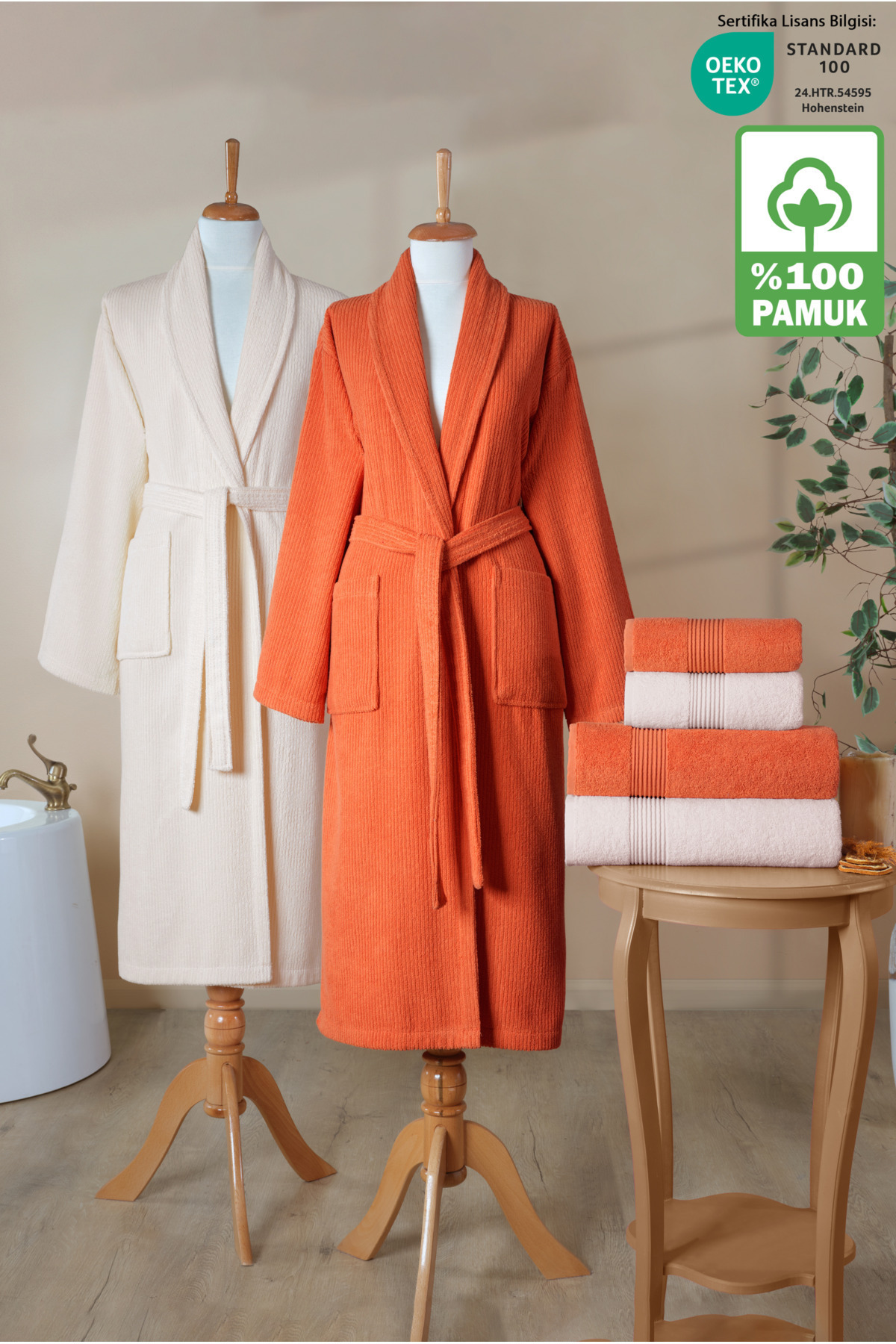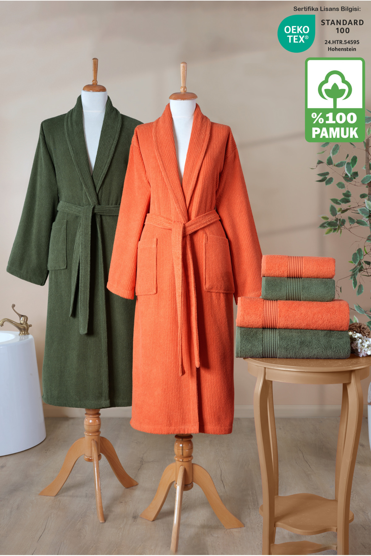6 Parça Çizgili Bornoz ve Baş Havlusu Takımı Kiremit Turuncu - Yeşil %100 Pamuk sertifikalı dokuma havlu kumaştan üretilmiştir.