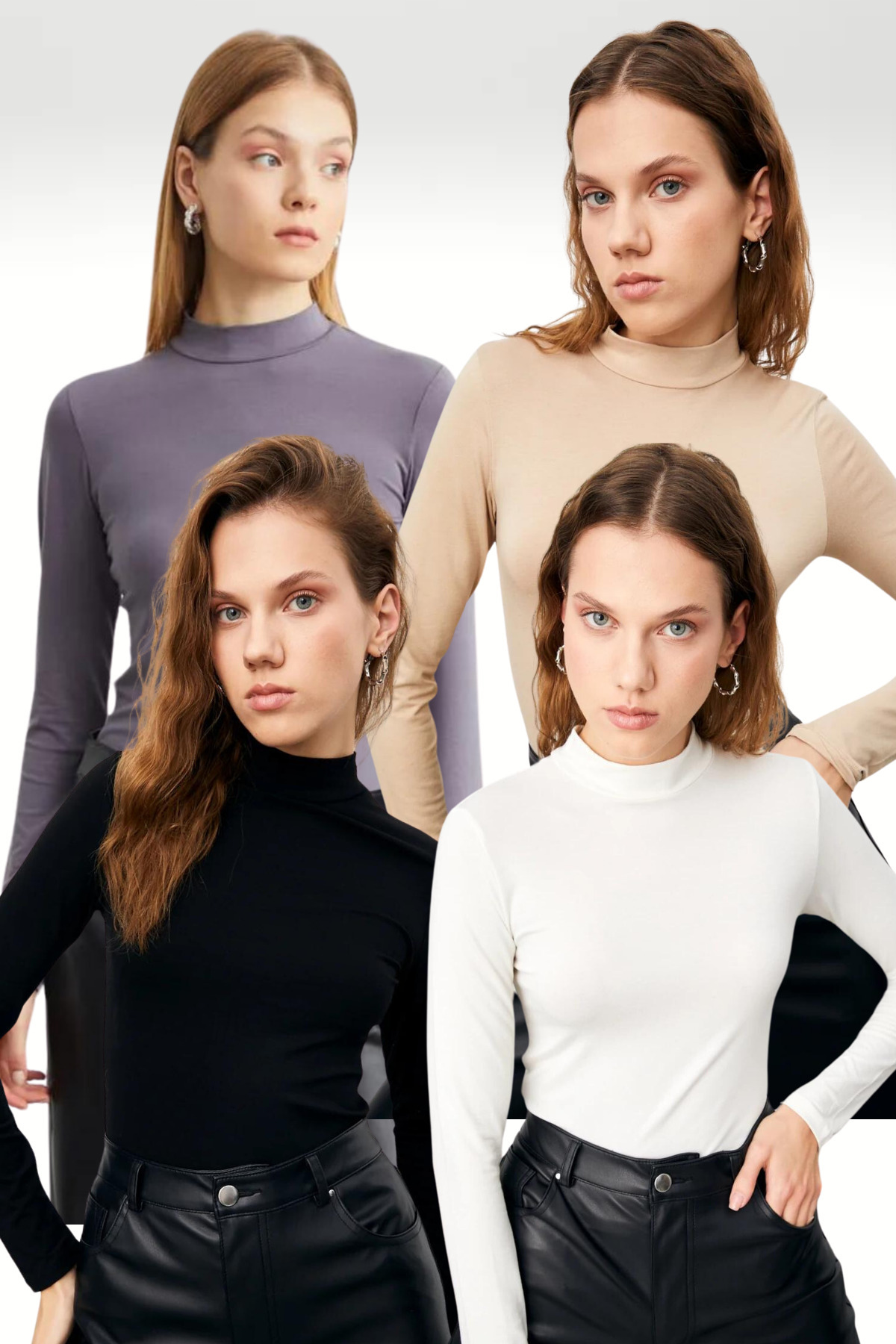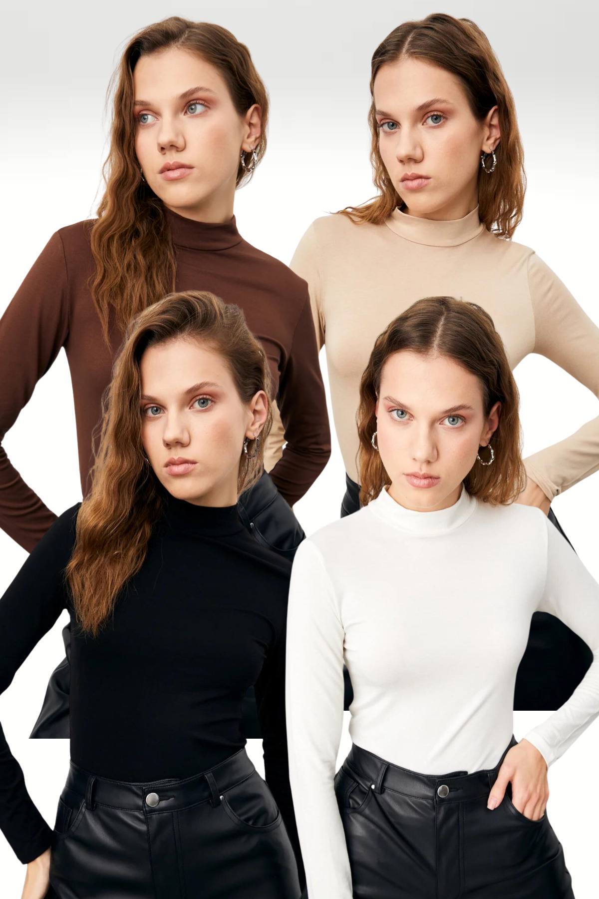 Kadın Gri Acı Kahve Siyah Beyaz 4'lü Yarım Balıkçı Yaka Basic Body