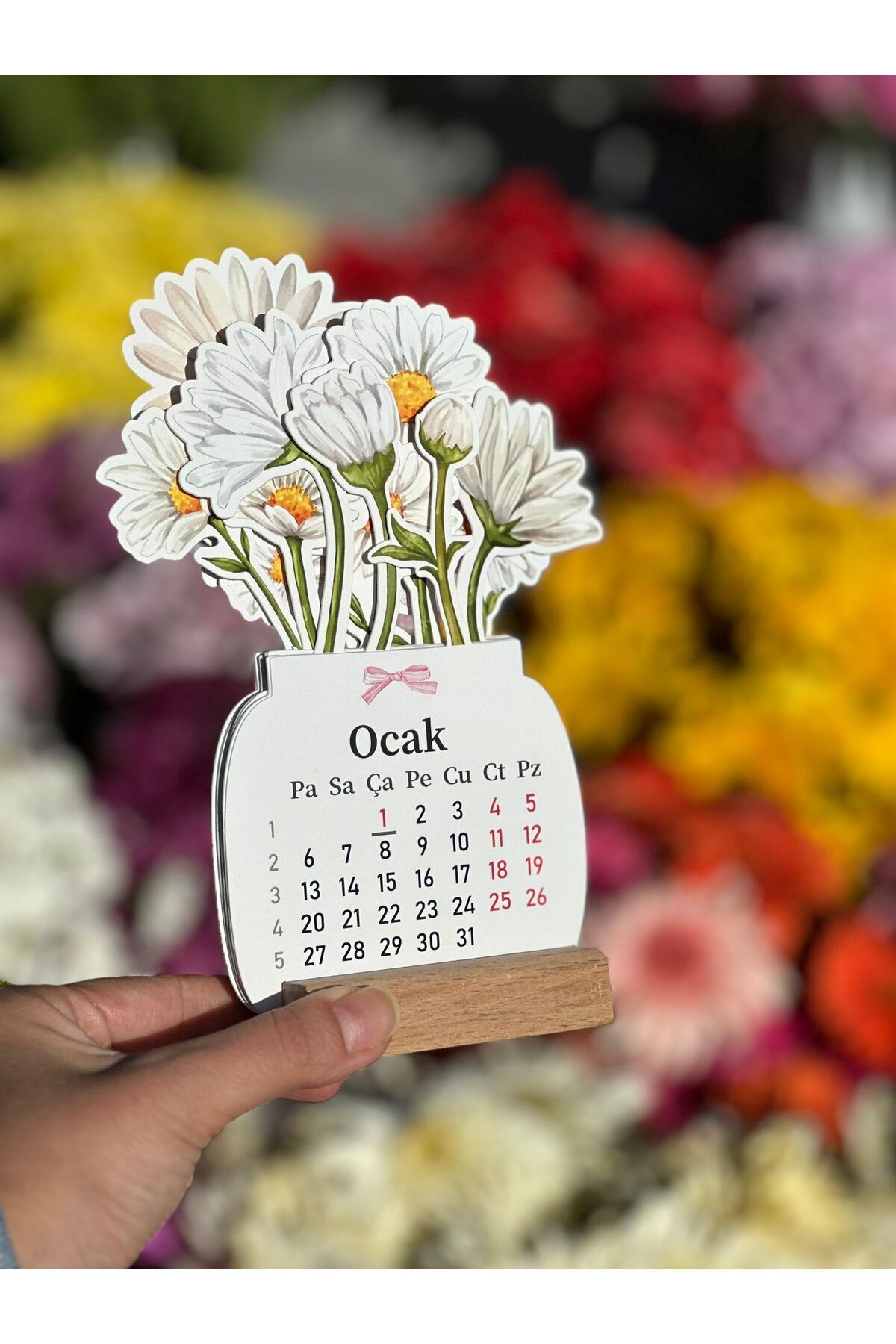 - Ahşap ayaklı tasarımı ile masaüstünüze şıklık katan çiçekli mini takvim, 2026 yılı için özel olarak hazırlanmıştır.