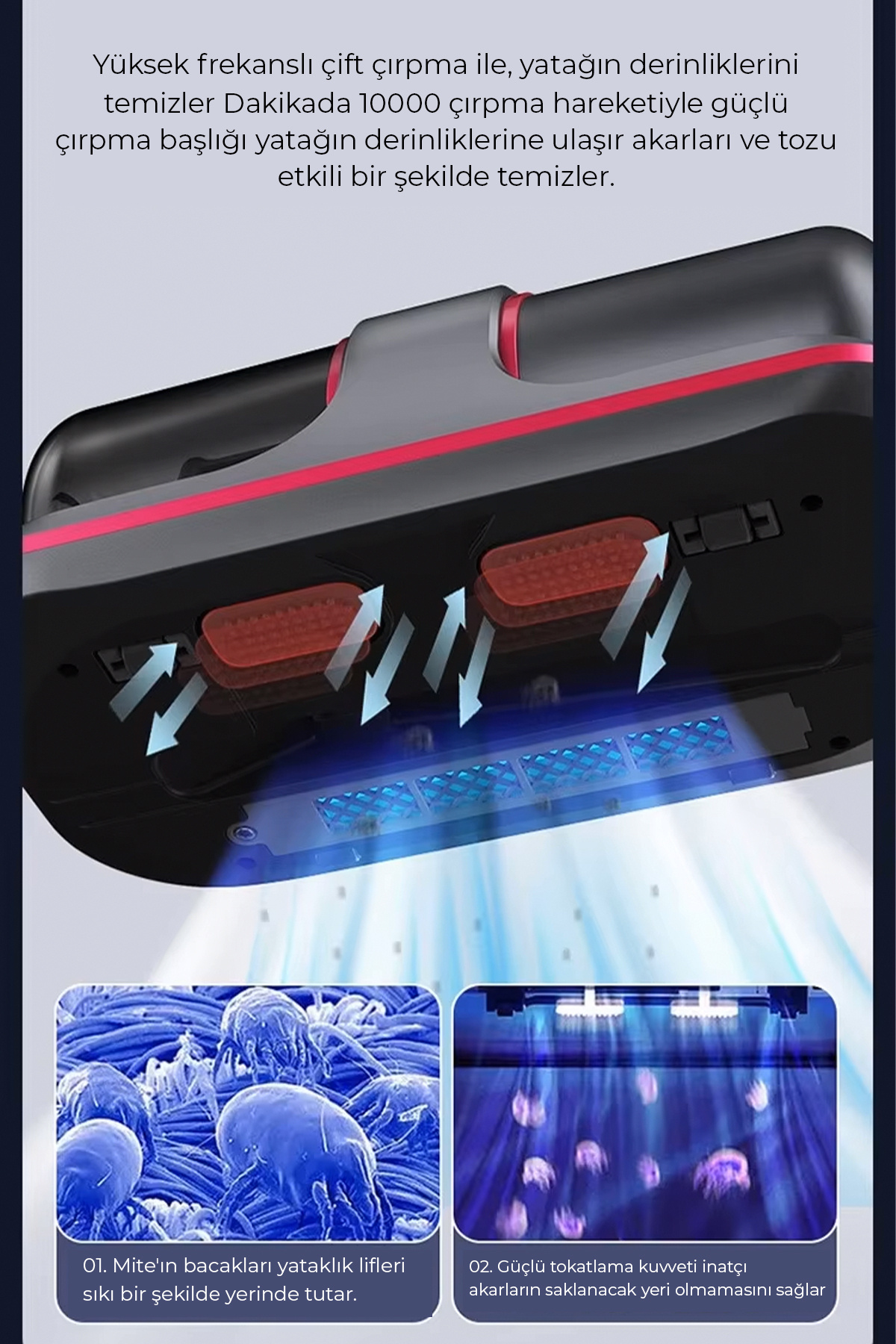 Ultra emiş gücü ile her türlü evcil hayvan tüyü, insan saçı ve kılı, mite ve akarları hepa filtresine hapseder.