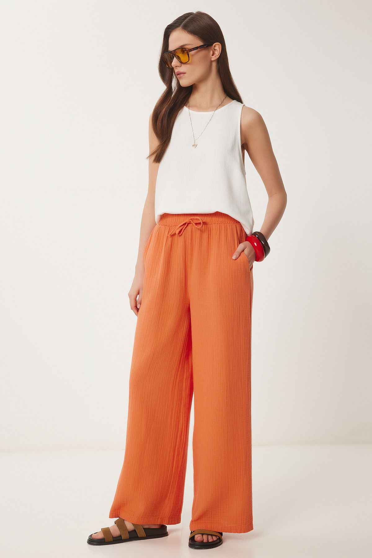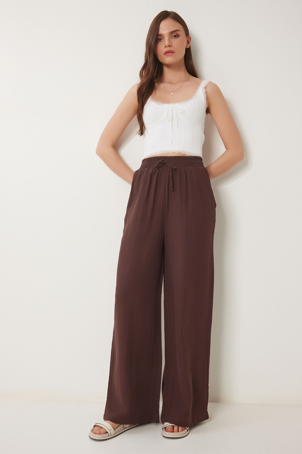 İp detaylı, beli lastikli, yan cepli, rahat, müslin palazzo pantolon.