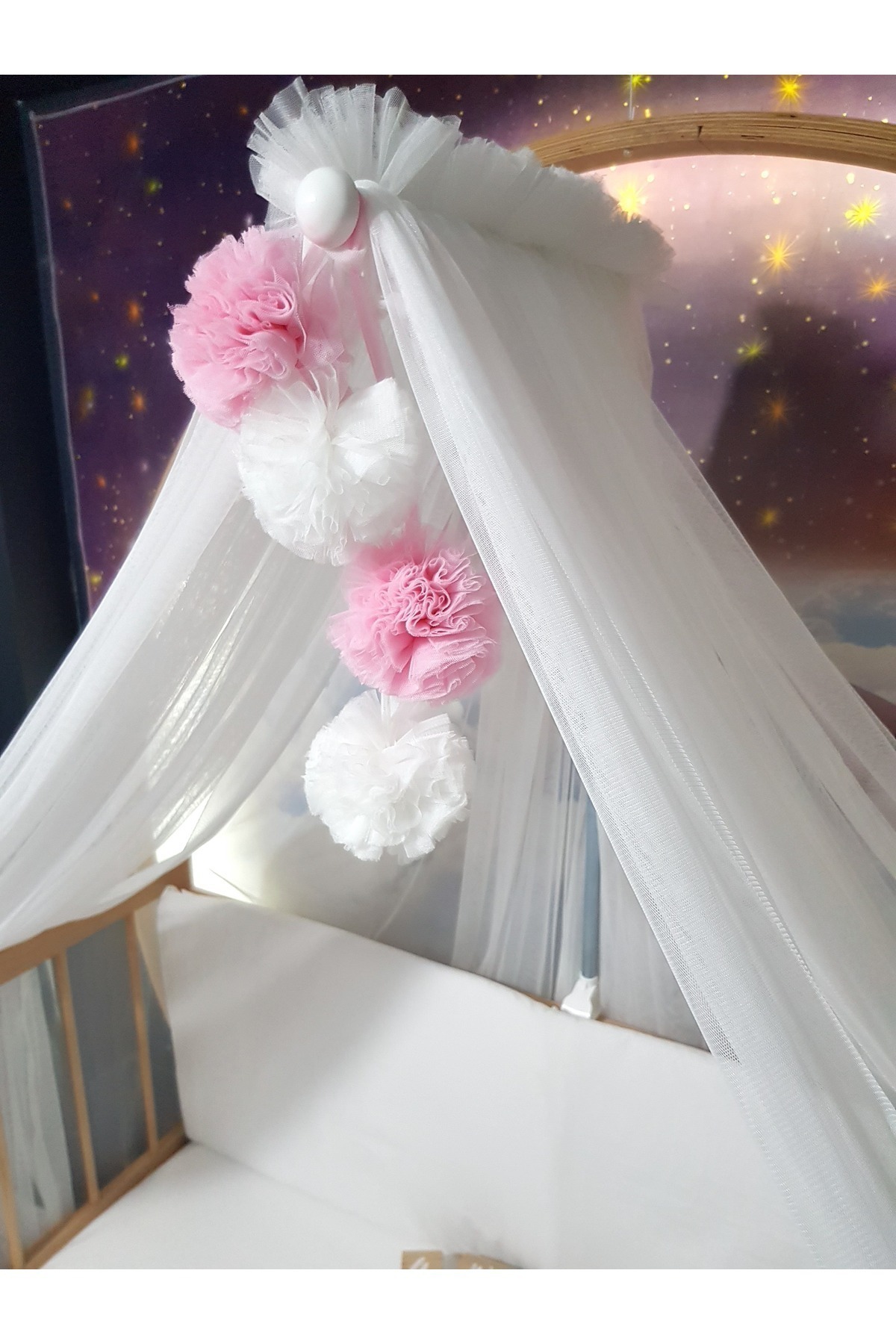 Dört Ponponlu Yumuşak Likra Tülden Lüks Cibinlik Modellerimizle Beşiğinize Zarafet Katın! Tül yüksekliği 175 cm ve çevresi 6 metredir.