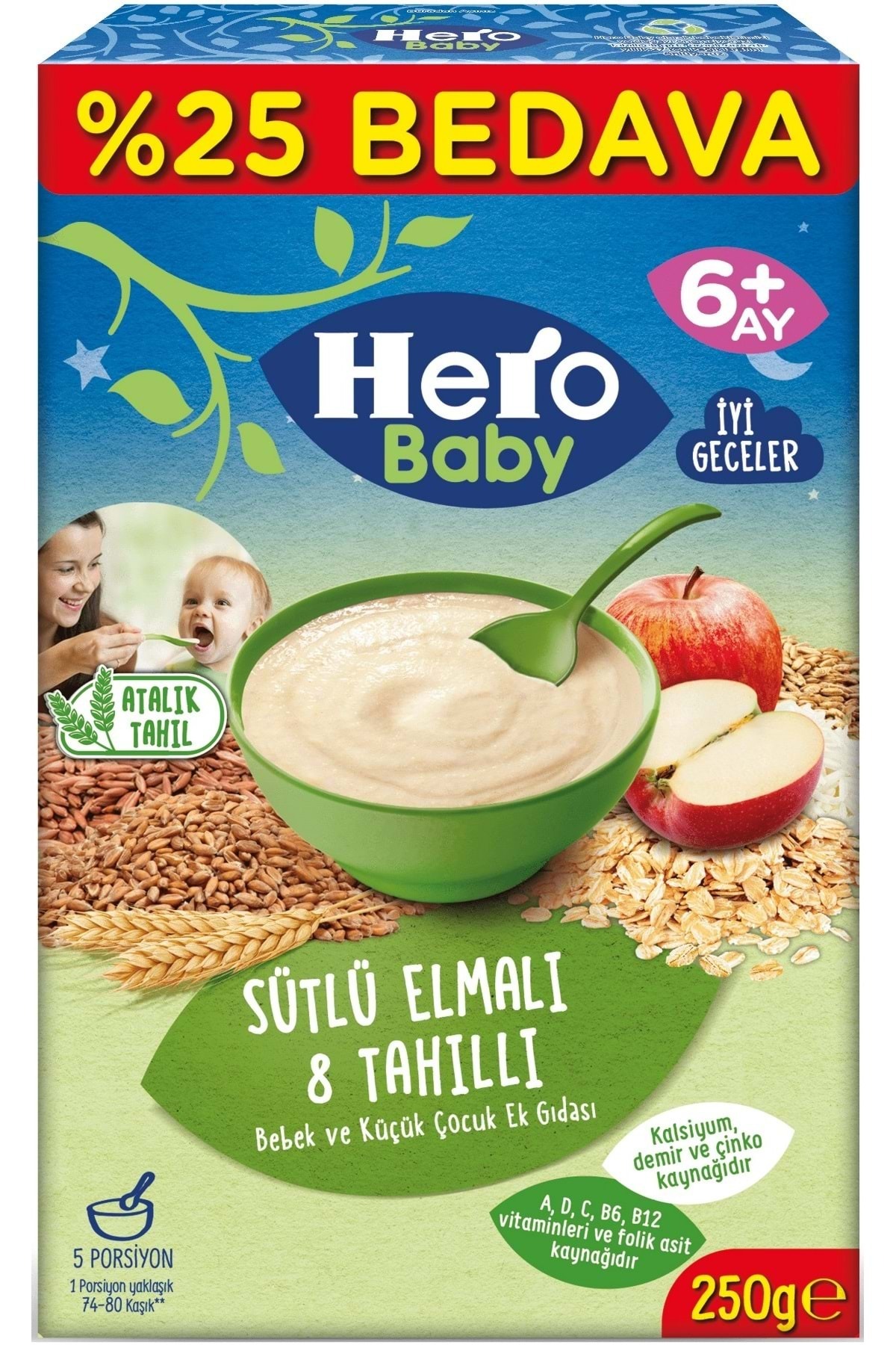 Hero Baby Kaşık Maması 250GR Sütlü Elmalı 8 Tahıllı (Avantaj Pk) (6 Lı Set) Bebeğiniz İçin En Doğalı Sizin gibi biz de bebeğiniz için her şeyi özenle seçiyoruz. Vitaminler ve mineraller, bebeğinizin sağlıklı büyümesi için çok önemlidir. İsviçreli Hero Baby tahıllı kaşık mamaları, özenle seçilmiş tahıllar ve eklenen vitaminlerle bebeğinizin günlük besin ihtiyacını karşılamaya yardımcı olur. Tarladan Sofraya Güvenilirlik Hero Baby, 130 yılı aşkın deneyimiyle, tarladan sofranıza kadar her aşamada ürünlerini titizlikle kontrol eder. Böylece bebeğiniz, güvenle ve keyifle Hero Baby ürünlerini tüketebilir. Farklı Lezzetler ve Kullanım Alanları Ek gıdaya geçiş: Hero Baby'nin lezzetli tatlarıyla bebeğinizin damak tadına uygun beslenme deneyimleri sunabilirsiniz. Farklı kombinasyonlar: İçerisine meyve veya sebze püresi ekleyerek farklı tatlar yaratabilirsiniz. Zenginleştirme: Sebze pürelerine veya çorbalara ekleyerek besin değerini artırabilirsiniz. Esnek kullanım: Kahvaltıda veya günün herhangi bir saatinde bebeğinize yedirebilirsiniz. Uyku öncesi: Hero Baby ürünleri, bebeğinizi uyumadan önce beslemek için idealdir.