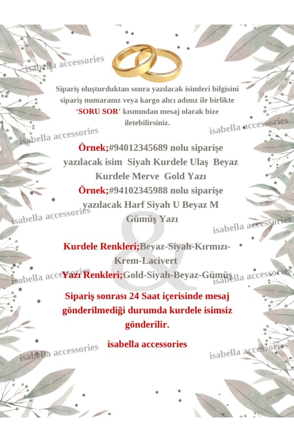 - Özel baskı teknolojisi sayesinde, isimleriniz net ve okunaklı bir şekilde kurdelelerin üzerine işlenir, böylece misafirleriniz isminizi kolayca görebilir.