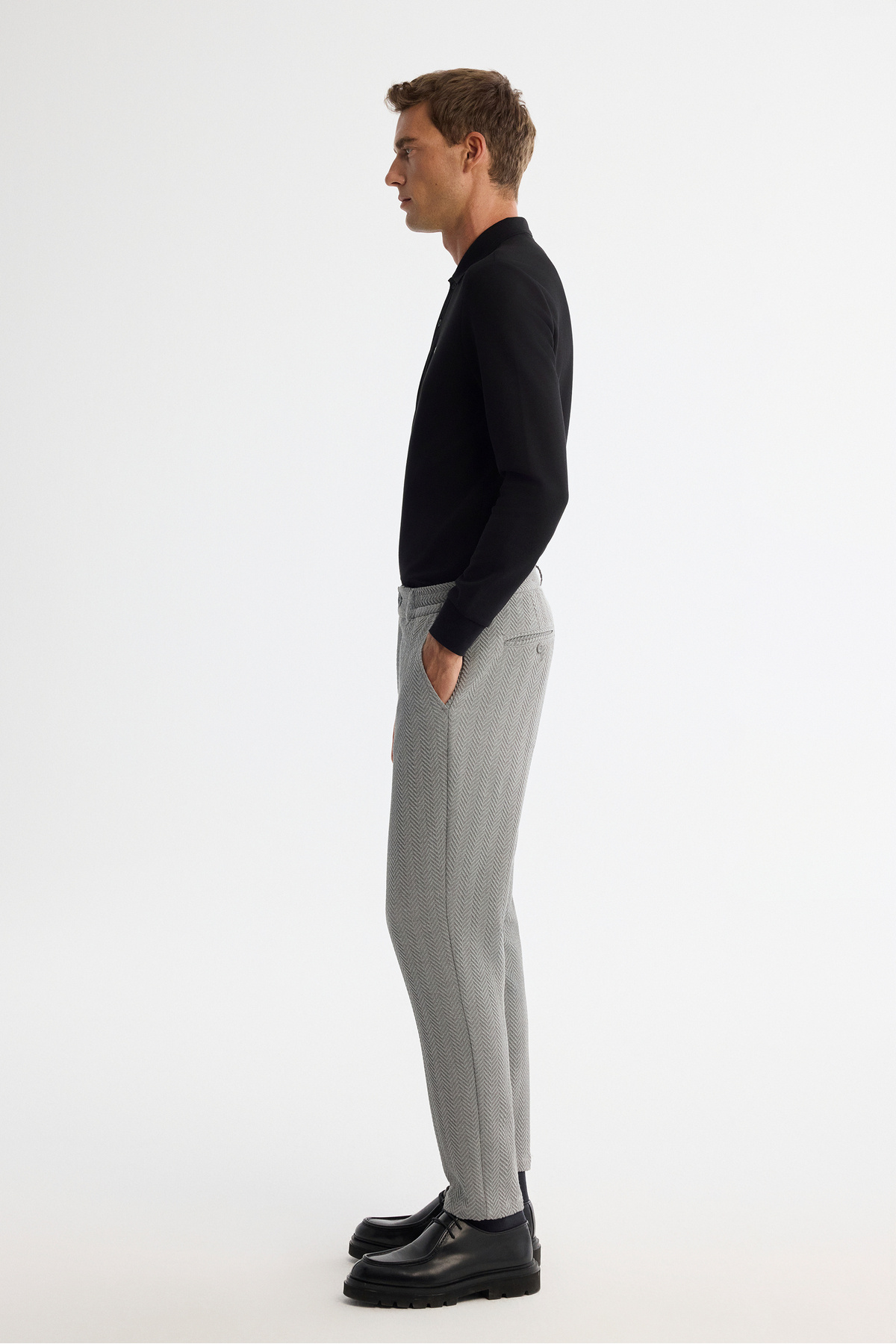 Yandan cepli, Balık sırtı dokulu, Yanı lastikli, Arkada düğmeli fleto cepli, Fermuar ve düğme kapama, Slim Fit Chino Pantolon