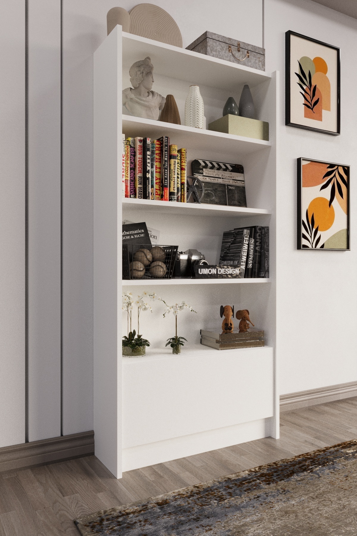 - UMON DESIGN TEOS Kitaplık beş adet rafı ve kapaklı fonksiyonel alanı ile geniş depolama kapasitesine sahip olup, kitaplarınızı ve diğer eşyalarınızı düzenli bir şekilde sergilemenize olanak tanır.