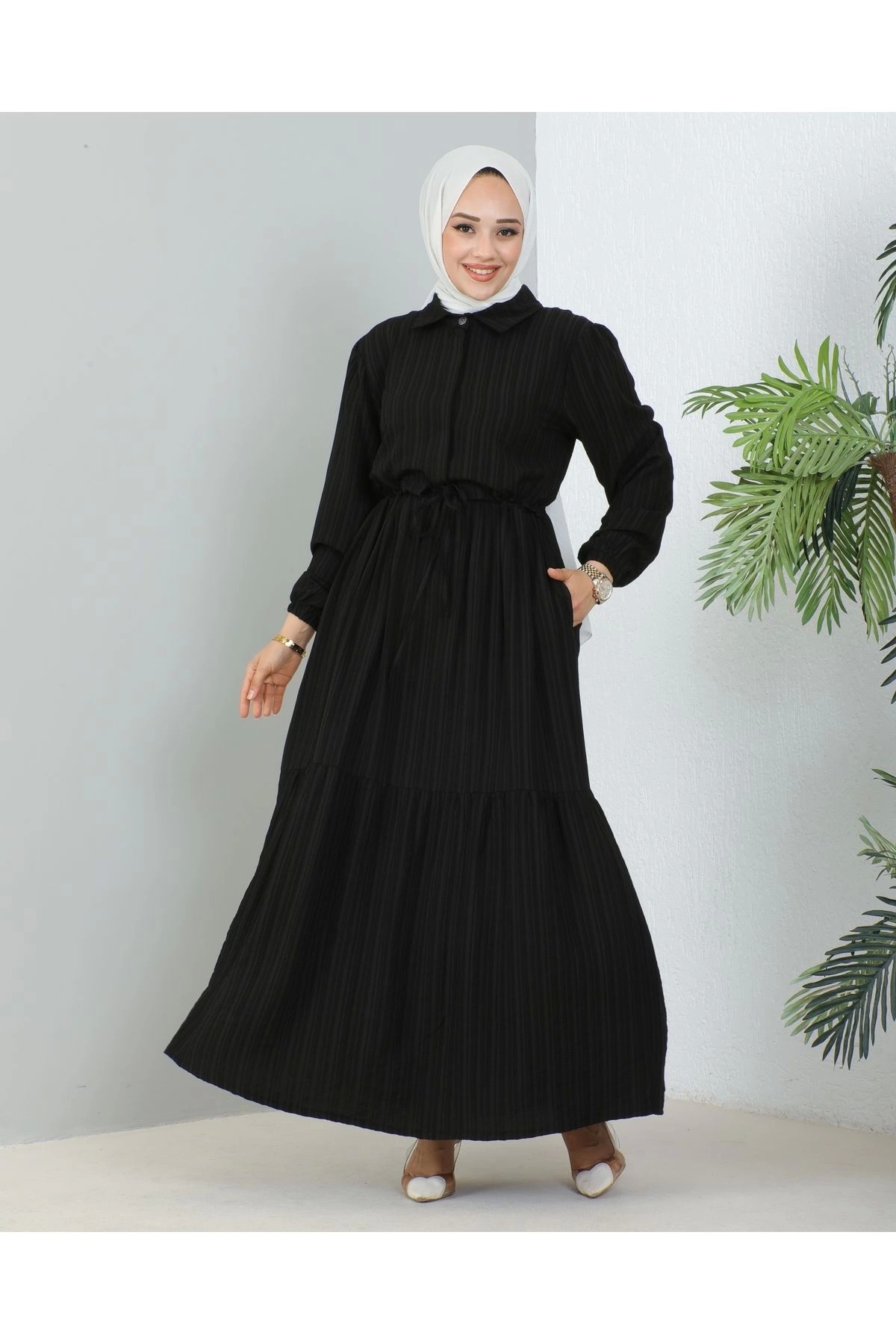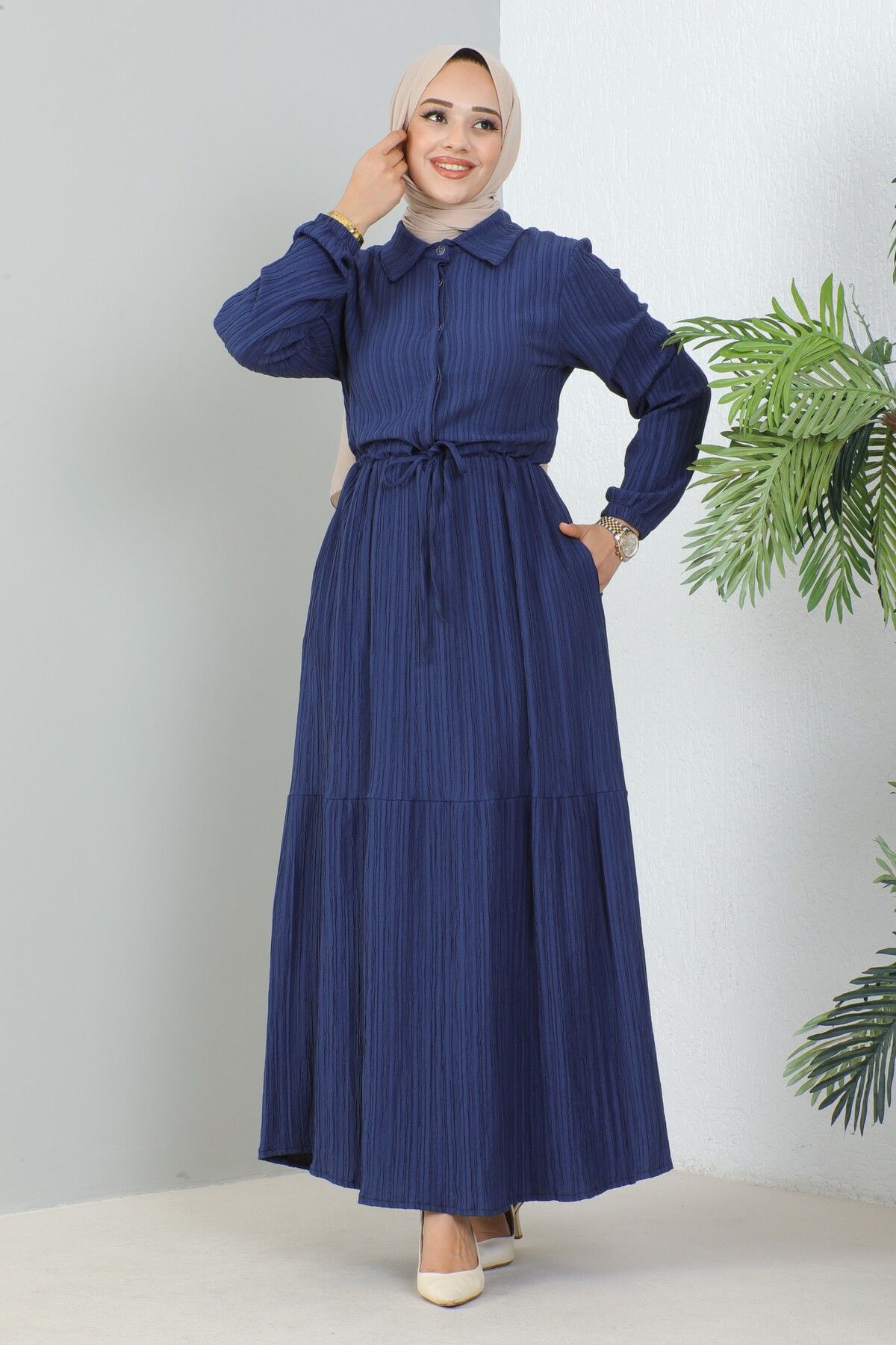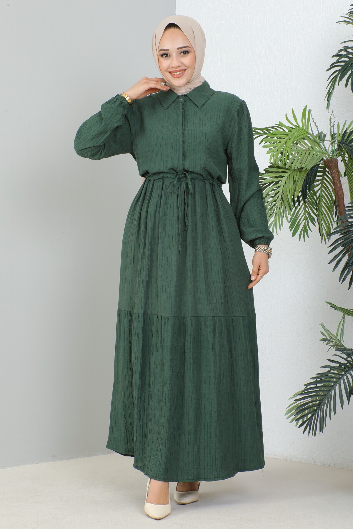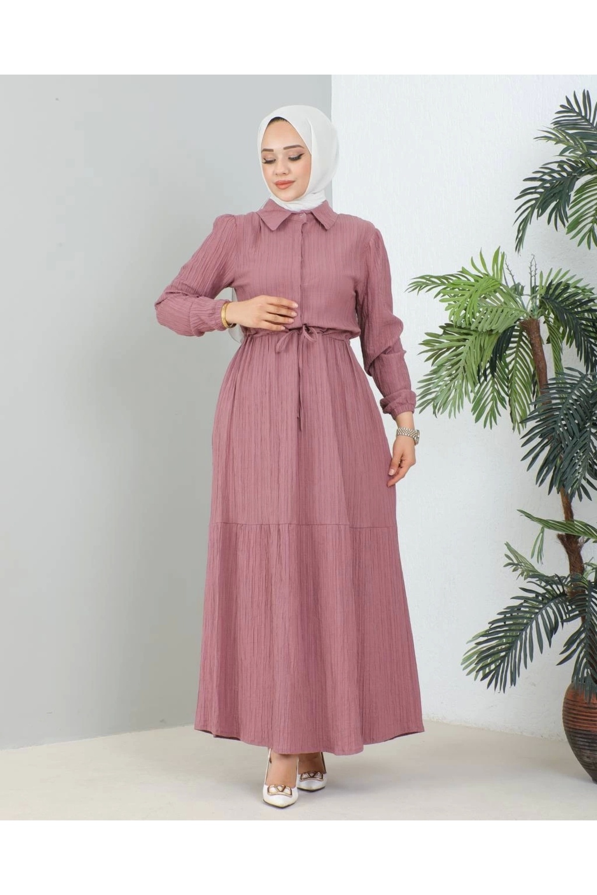 Ürün Boyu: 145 cm Ürün Özelliği: Yeni sezon tesettür modasının şık bir parçası olan bu elbise, gömlek yaka ve yarım düğme detayları ile modern ve zarif bir görünüm sunar.