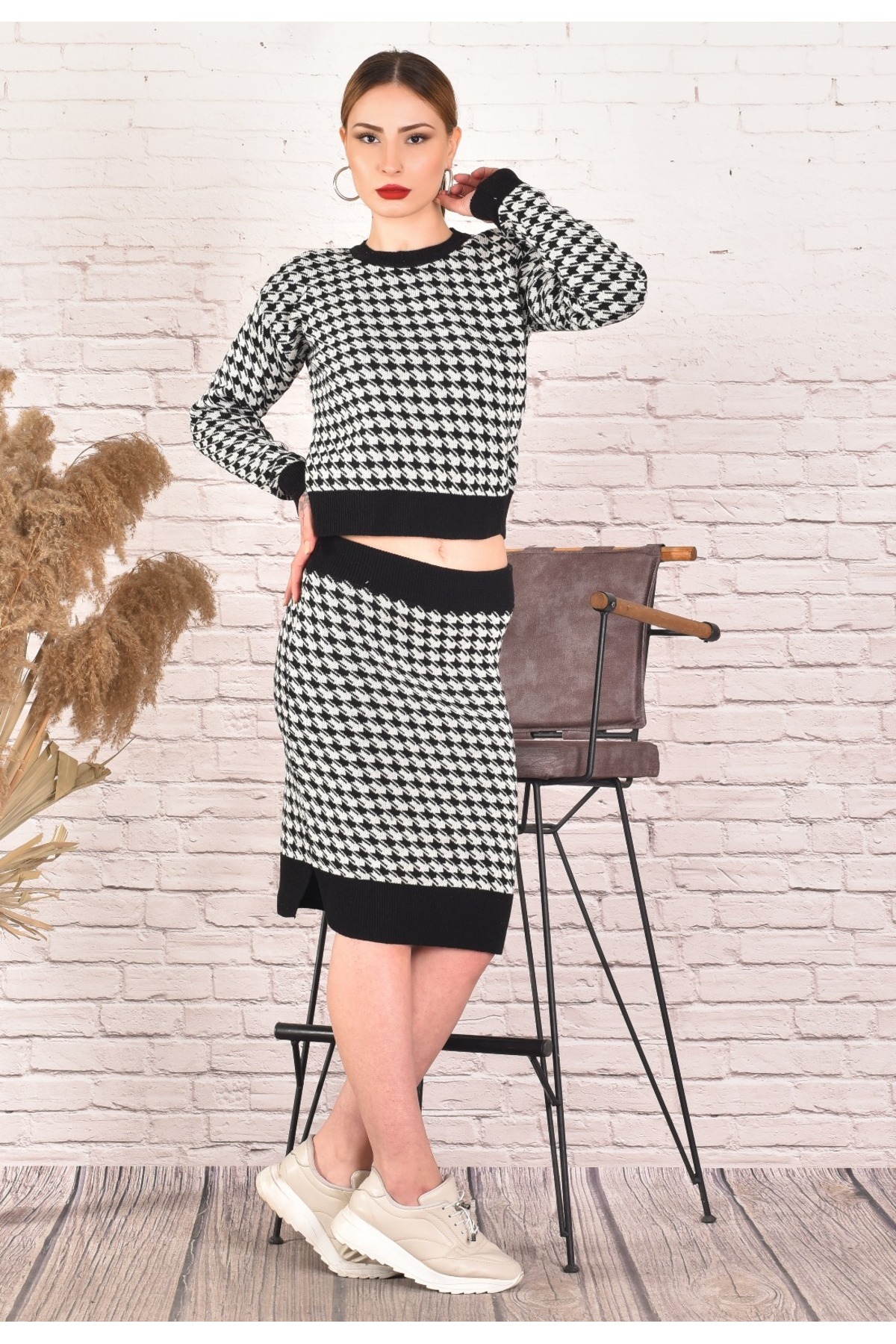 - Siyah Gold düğmeli triko pileli hırka ve etek takım, şıklığı ve rahatlığı bir arada sunar.
