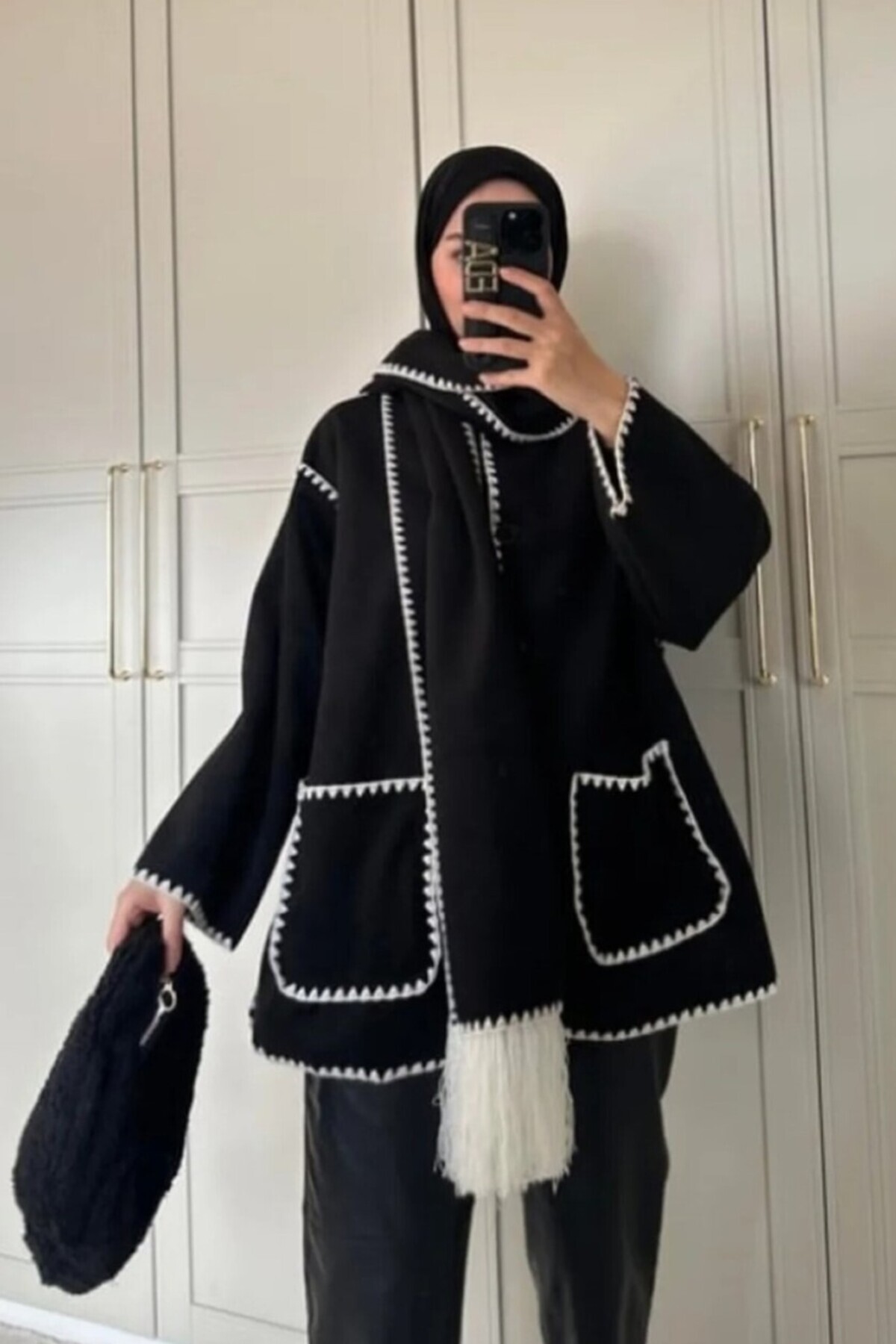 Nakış Detaylı Atkılı Yumuşak Kaşe Kaban - Ceket