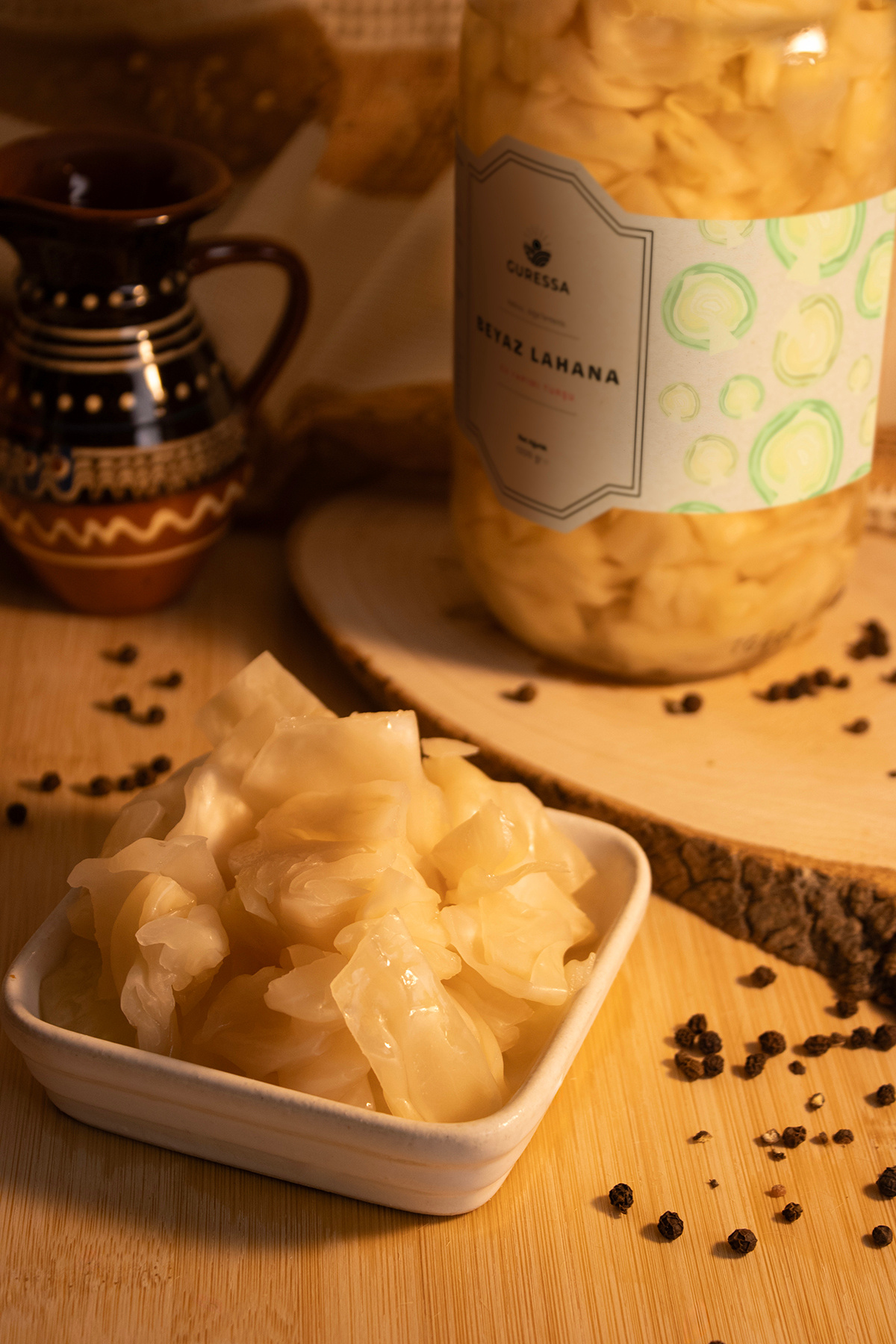 Sadece taze beyaz lahana, kaya tuzu, sirke ve limon ile doğal fermente yöntemiyle hazırlanmıştır.