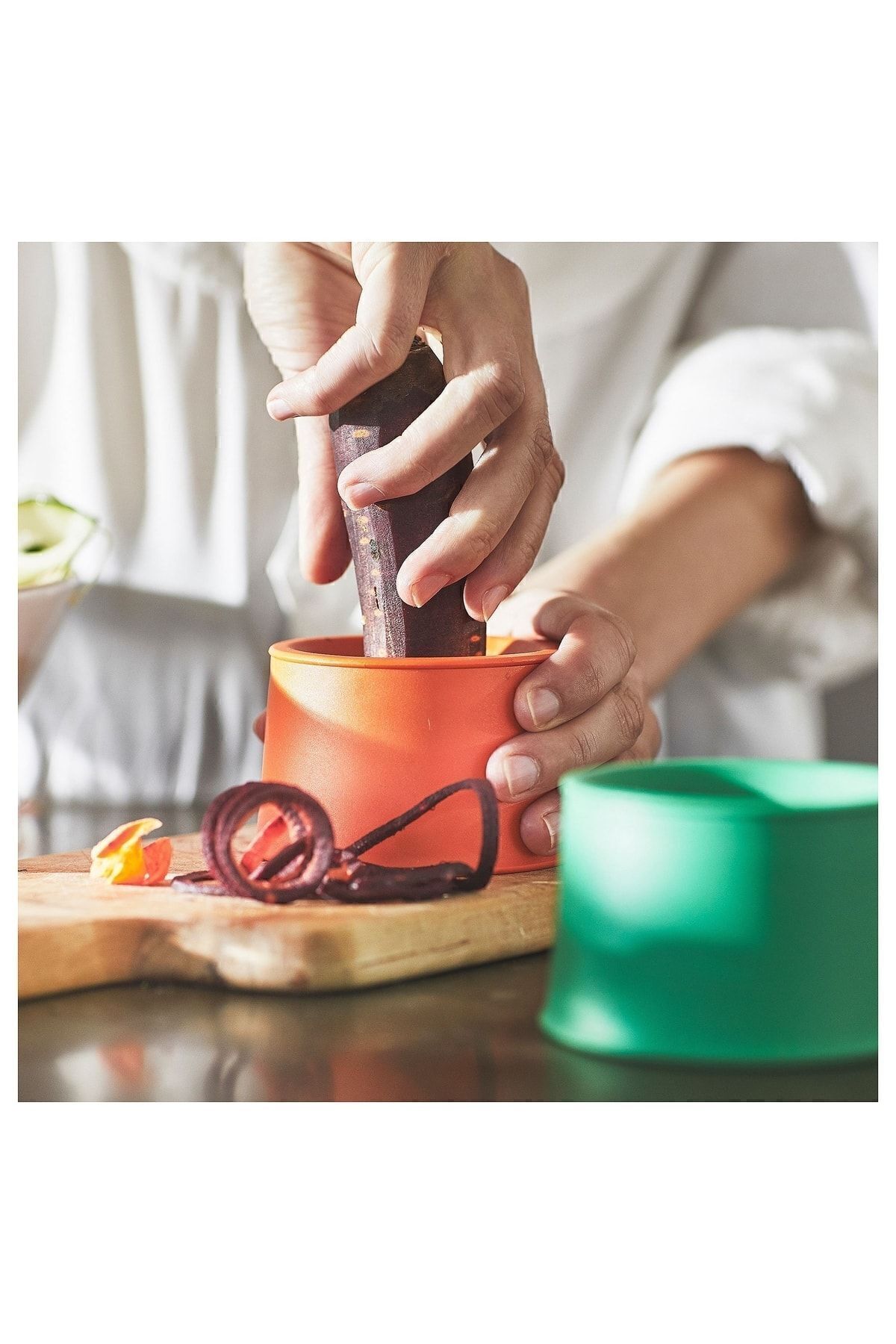 UPPFYLLD sebze dilimleyici tüm sebzeler için kullanılabilir, ancak özellikle salatalık, kabak, havuç ve tatlı patates gibi uzun sebzeler için uygundur.