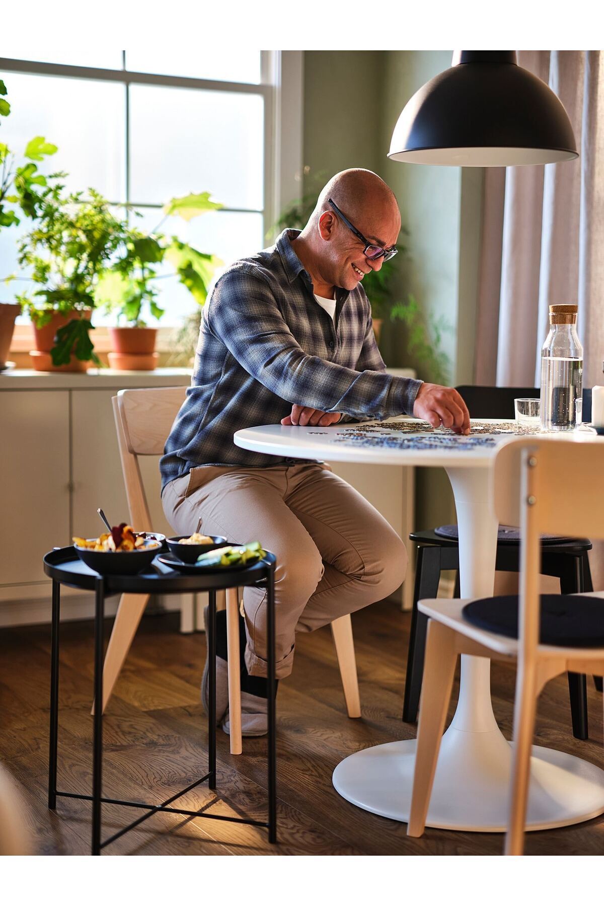 Kenarları yuvarlatılmış masa, odanın içinde rahatlatıcı bir atmosfer yaratır.