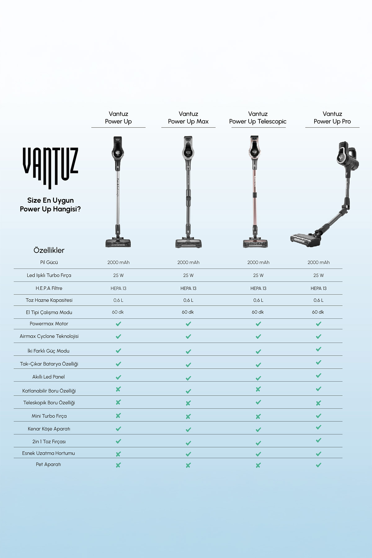 Power ve Turbo olarak iki farklı moda sahip Vantuz Power Up , zemin ve kir tipine göre modlar arasında geçiş yaparak daha uzun çalışma süresi sunar. Farklı zeminlerde aktif temizlik sağlar.
