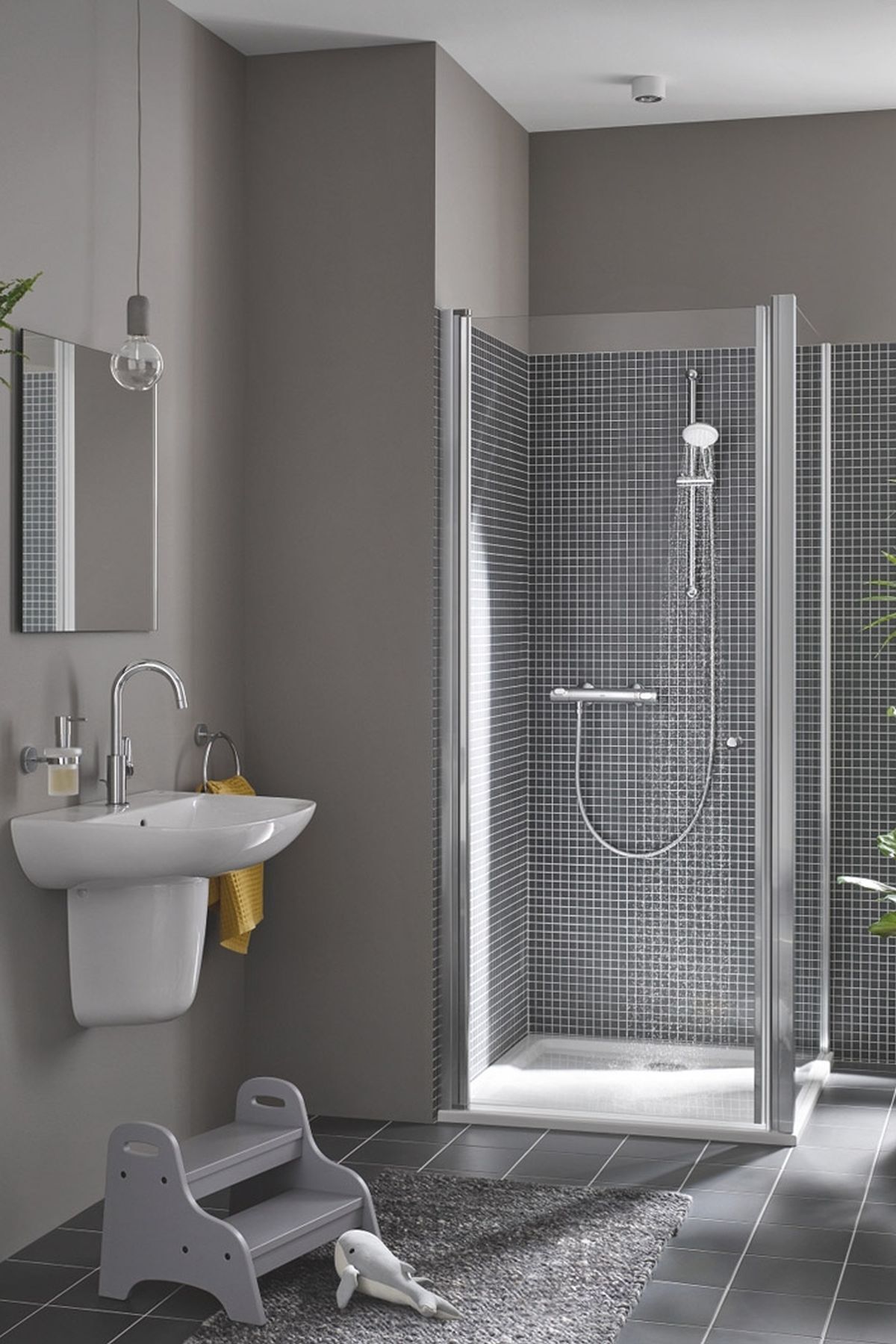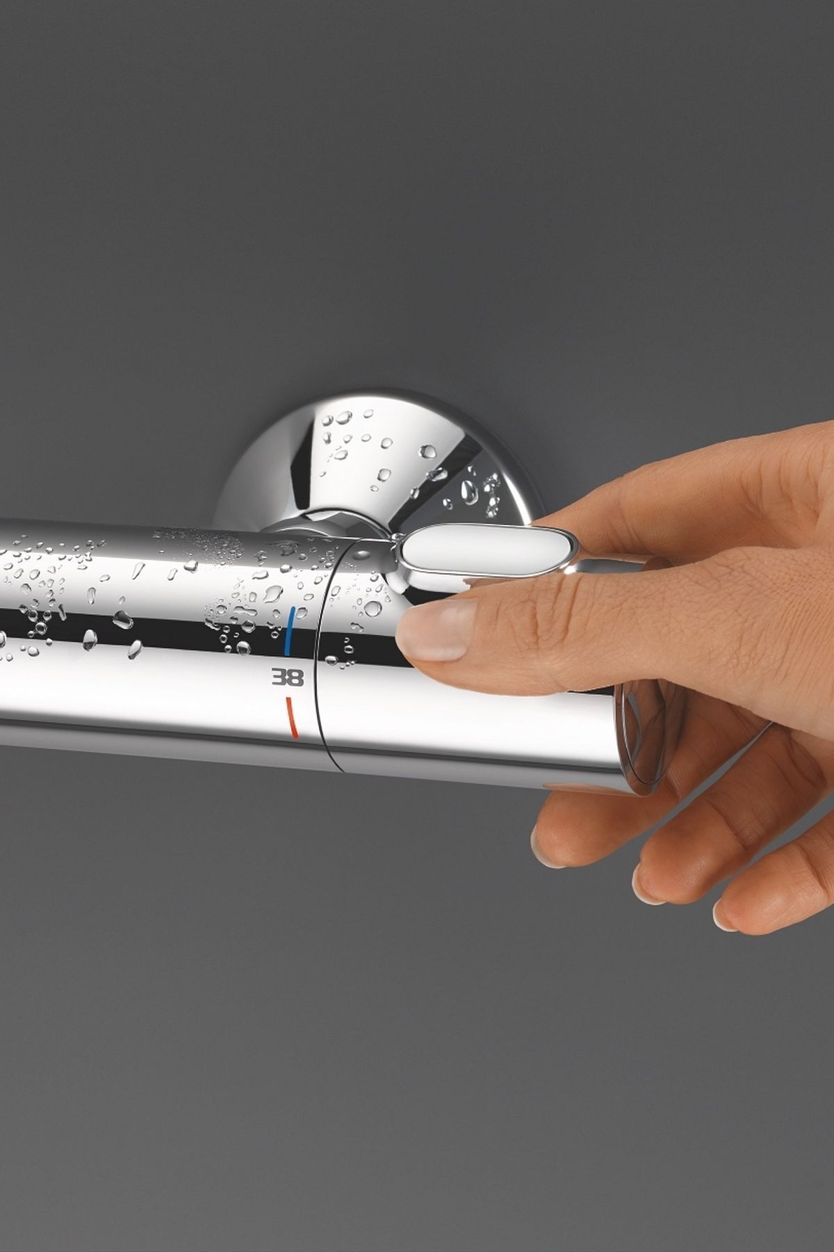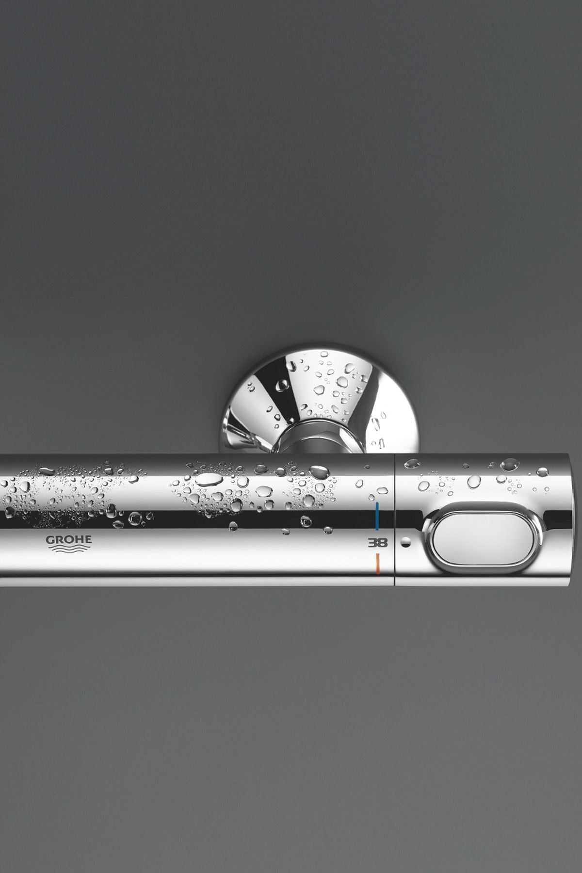 • THE GROHE GROHTHERM 500 THERMOSTATİC SHOWER MİXER – SAFETY AND SUSTAİNABİLİTY İN A STYLİSH SHAPE duvar tipi GROHE StarLight krom kaplama GROHE SafeStop 38°C’de sabitlenebilir sıcaklık GROHE SafeStop Plus opsiyonel 43°C sabitelenebilir sıcaklık GROHE thermostatic cartridge with wax thermoelement entegre miks su kapatma volume handle with GROHE EcoButton headpart 90° duş alt çıkışı 1/2" entegre çek valf entegre filtre entegre çek valf ekzantrik metal rozet GROHE EcoJoy daha az su tüketimive mükemmel akış teknolojisi