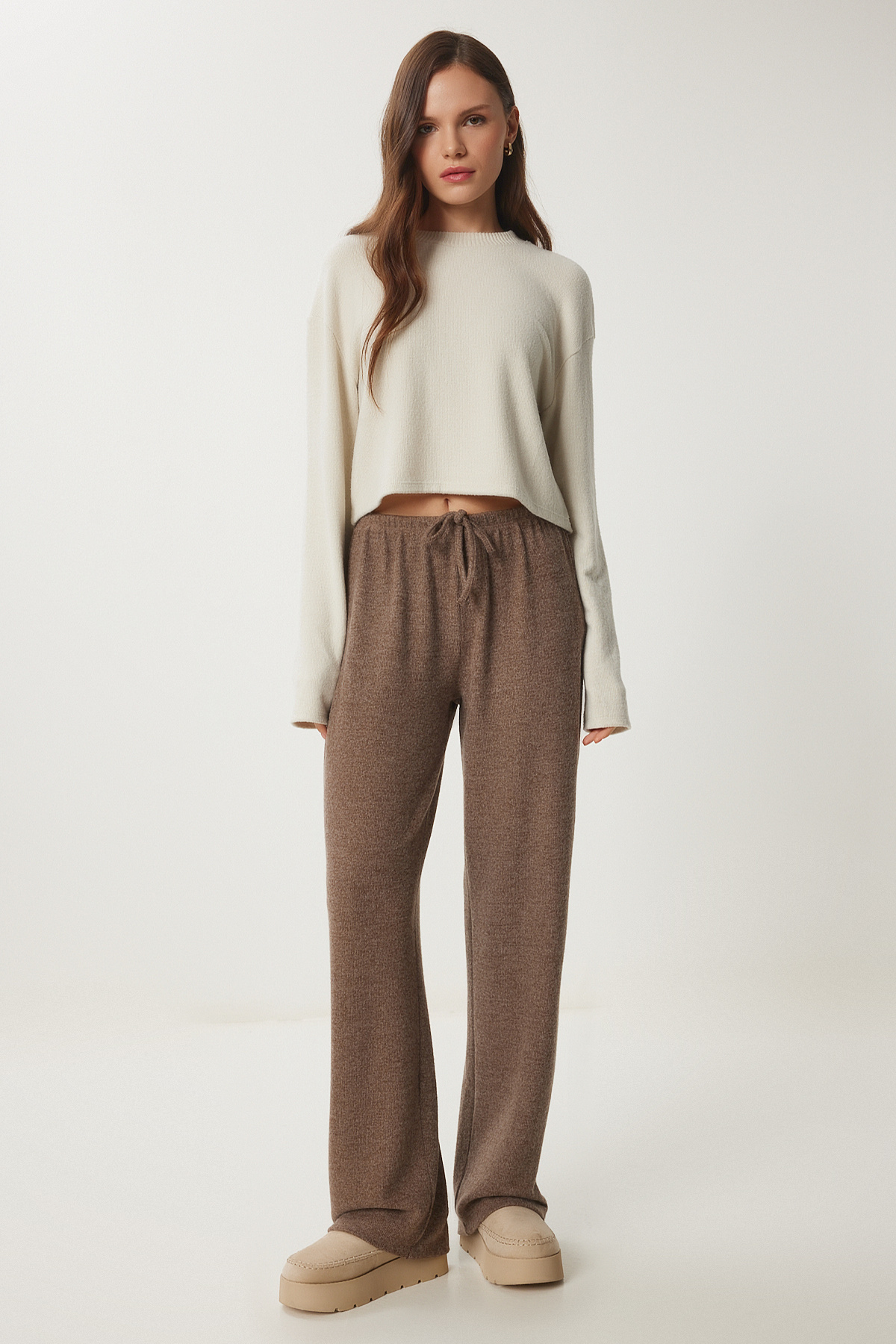 Elastik bağlamalı bel, esnek yapılı, yumoş, bol örme pantolon İçerik: %72 Polyester %25 Viskon %3 Elastan Ürün boyu: 103 cm Bel: 36 Cm 30° makinede yıkanabilir.