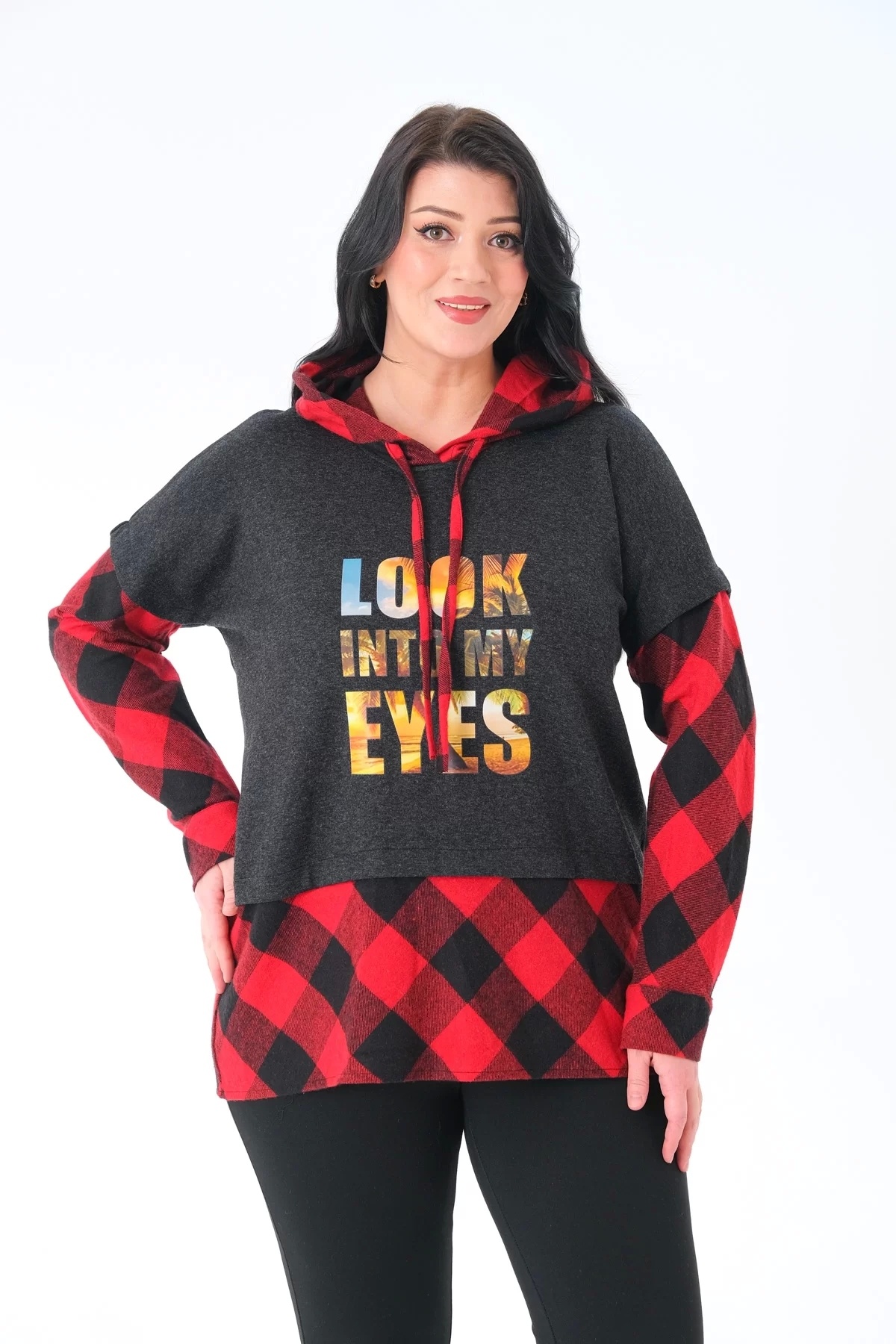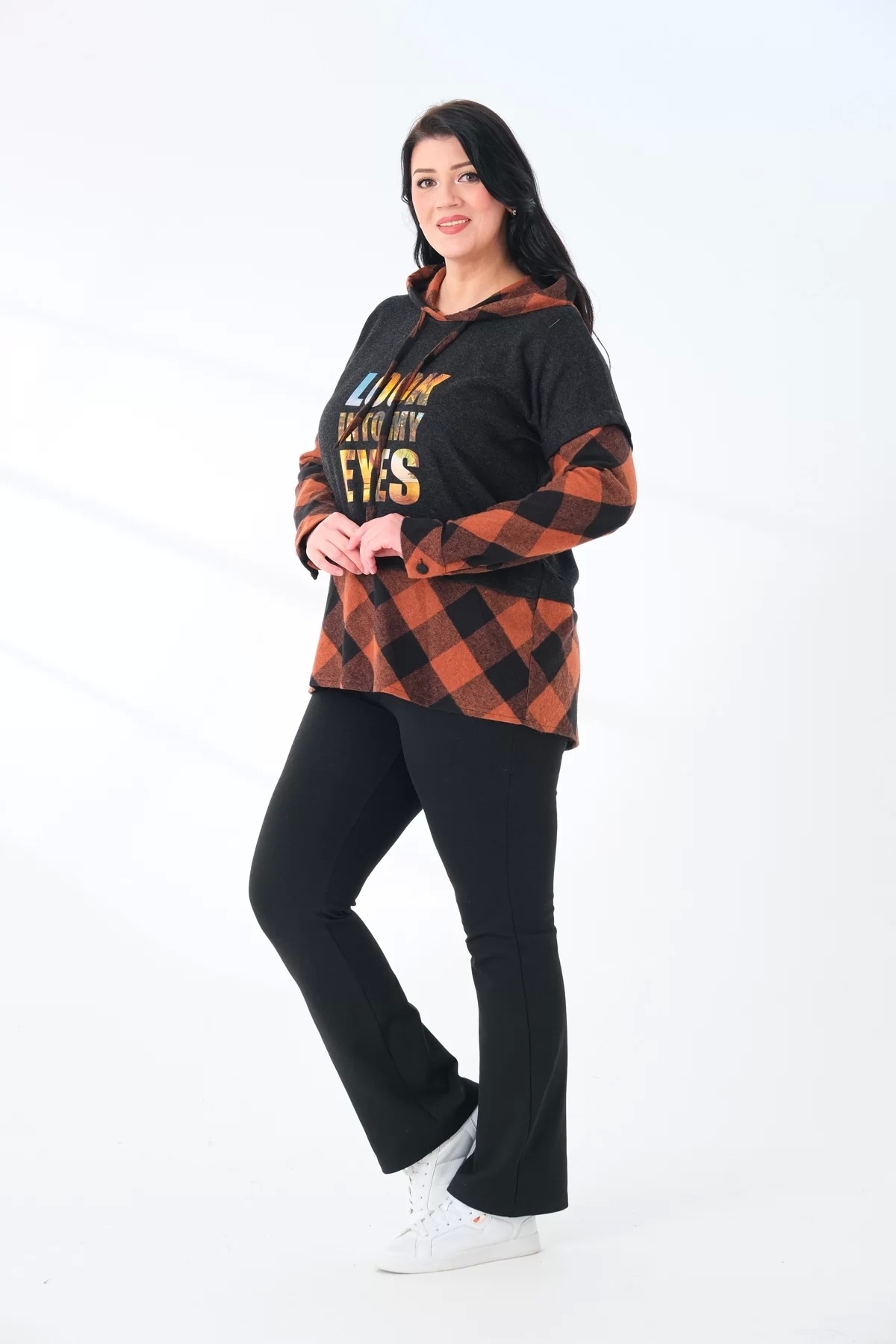Ekoseli Oversize Kapüşonlu Büyük Beden Dokuma Sweatshirt